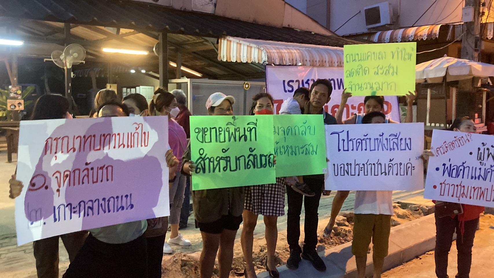 ชาวบ้านพัทยาประท้วงการก่อสร้างเกาะกลางถนนเทพประสิทธิ์ วอนผู้เกี่ยวข้องพิจารณาเพิ่มจุดยูเทิร์นลดอุบัติเหตุ