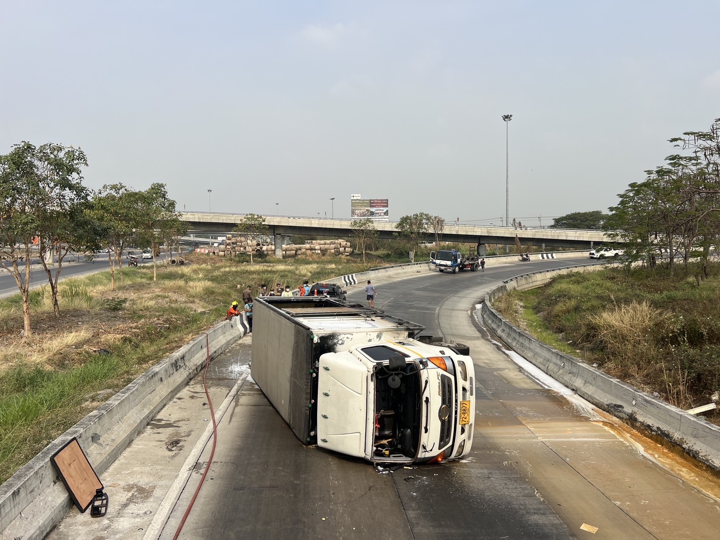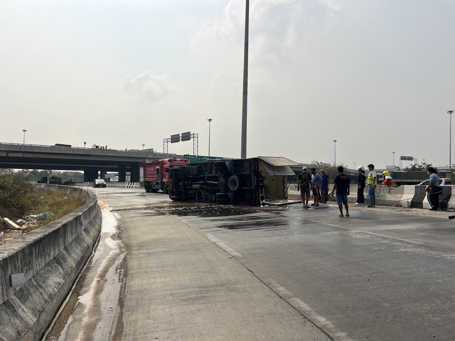 เมื่อเวลา 10.00 น.วันที่ 21 กุมภาพันธ์ 2568 เจ้าหน้าที่ตำรวจ สภ. บางบัวทอง จ.นนทบุรี ได้รับแจ้งมีรถบรรทุก 6 ล้อ บรรทุกน้ำกรดพลิกคว่ำ เหตุเกิดบริเวณถนนต่างระดับ 345 ต.ละหาร อ.บางบัวทอง มุ่งหน้า จ.ปทุมธานี จึงเร่งเข้าตรวจสอบที่เกิดเหตุเป็นช่วงทางโค้งลงจากสะพานต่างระดับมุ่งหน้าไปทางแยกบางคูวัด จ.ปทุมธานี พบรถบรรทุก 6 ล้อ แบบตู้ทึบยี่ห้อ ฮีโน่ ทะเบียน 72-6877 นครปฐม พลิกตะแคงขวางถนน ภายในรถพบถังน้ำกรดไนตริก จำนวน 4 ถัง โดยน้ำกรดได้กัดเหล็กของรถจนกลายเป็นควันสีเหลืองเบื้องต้นเจ้าหน้าที่ได้ปิดการจราจรไม่ให้รถผ่าน ขณะที่เจ้าหน้าที่ดับเพลิงต้องใช้น้ำยาโฟมฉีดกลุ่มควันโดยใช้เวลาเคลื่อนย้ายรถและถังน้ำกรดออกจากถนนได้อย่างปลอดภัยโดยใช้เวลาประมาณ 1 ชั่วโมง