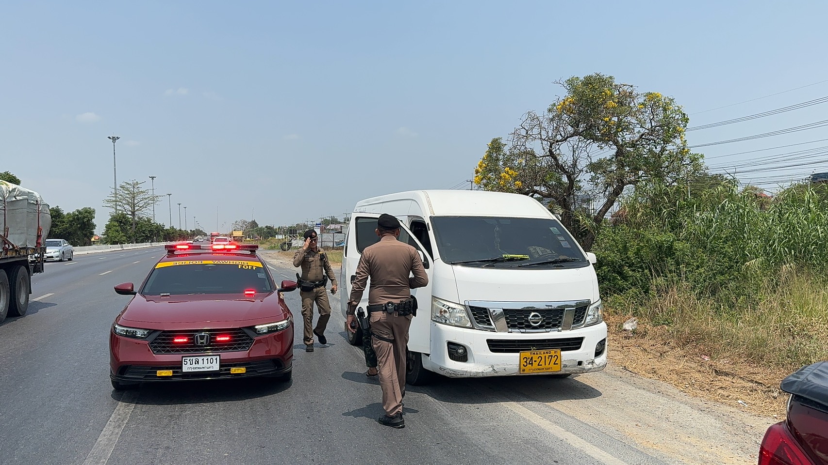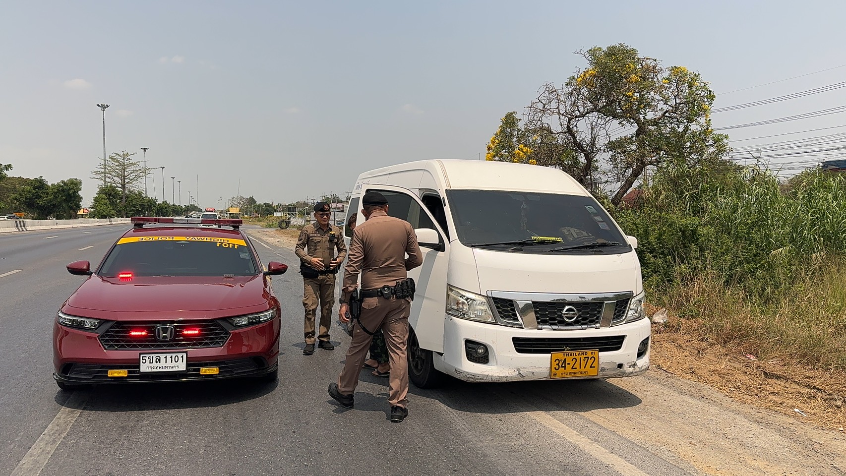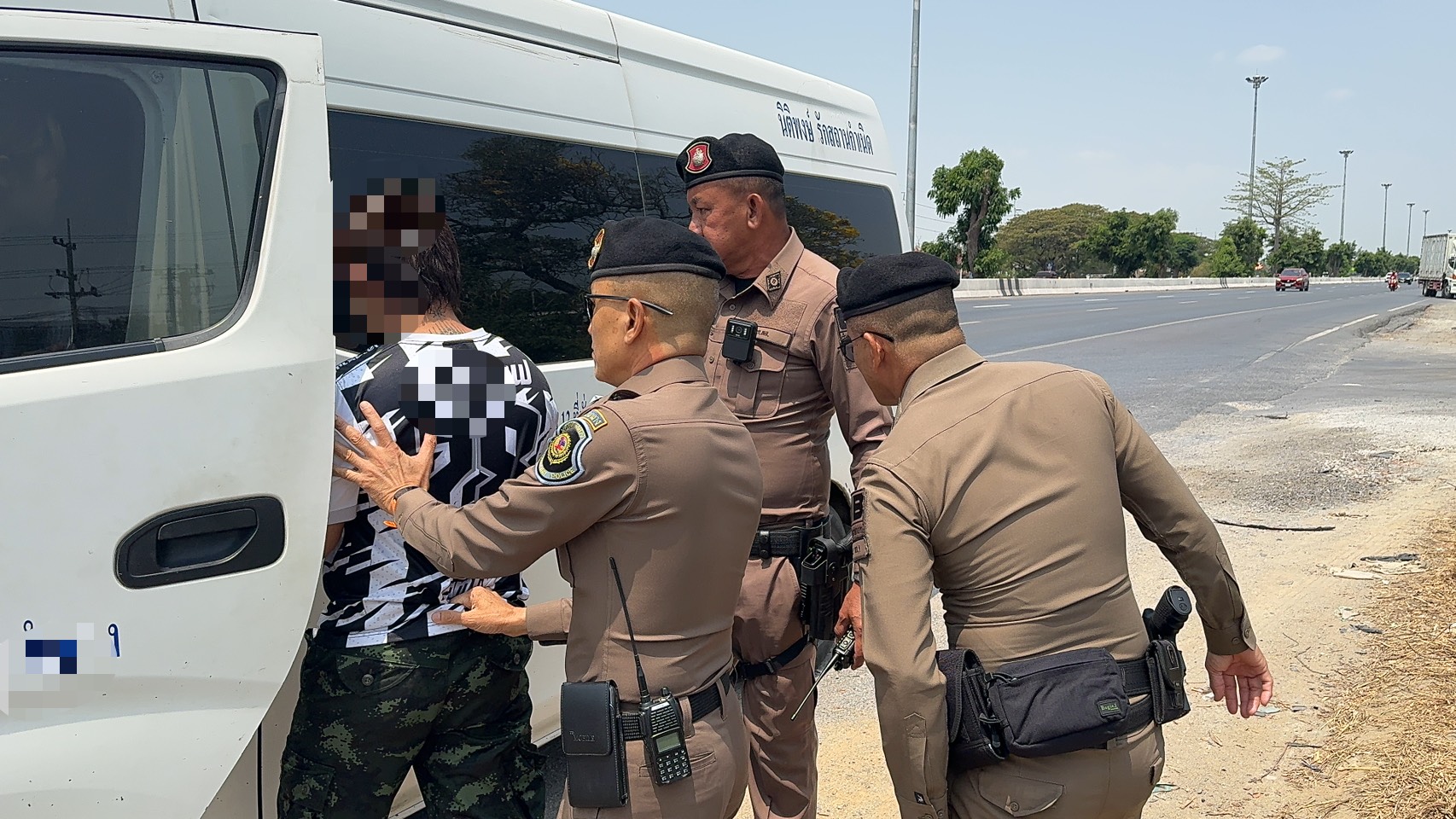 จนกระทั่งเมื่อวันที่ (1 เมษายน 2568 ) เวลาประมาณ 12.00 น. ขณะที่เจ้าหน้าที่ตำรวจชุดจับกุมได้สำรวจเส้นทางโดยพบรถโดยสารไม่ประจำทาง ยี่ห้อ NISSAN สีขาว ทะเบียน 34-2172 กรุงเทพมหานคร ขับขี่ผ่านมาลักษณะติดฟิล์มมืดทึบขับขี่เปลี่ยนช่องทางกระทันหันมีเหตุอันควรต้องสงสัย เจ้าหน้าที่ตำรวจได้ส่งสัญญาณไฟกระพริบสีแดงและใช้สัญญาณเสียงเรียกรถยนต์คันดังกล่าวให้หยุด จนกระทั่งมาถึง บริเวณ กม.30-31 ถนนสายเอเซีย(ขาเข้า) ตำบลบางเดื่อ อำเภอบางปะหัน จังหวัดพระนครศรีอยุธยา เจ้าหน้าที่ตำรวจจึงได้แสดงตนขอทำการตรวจสอบ