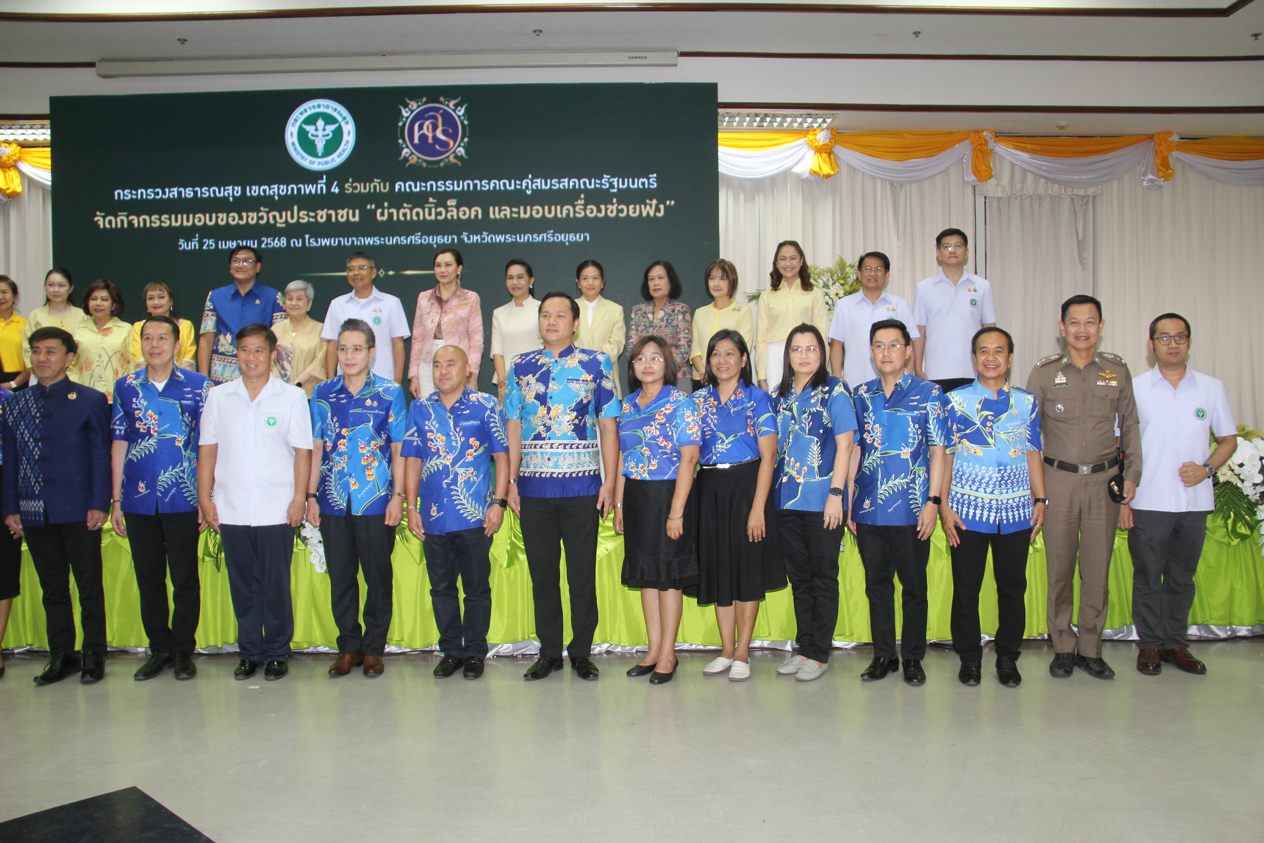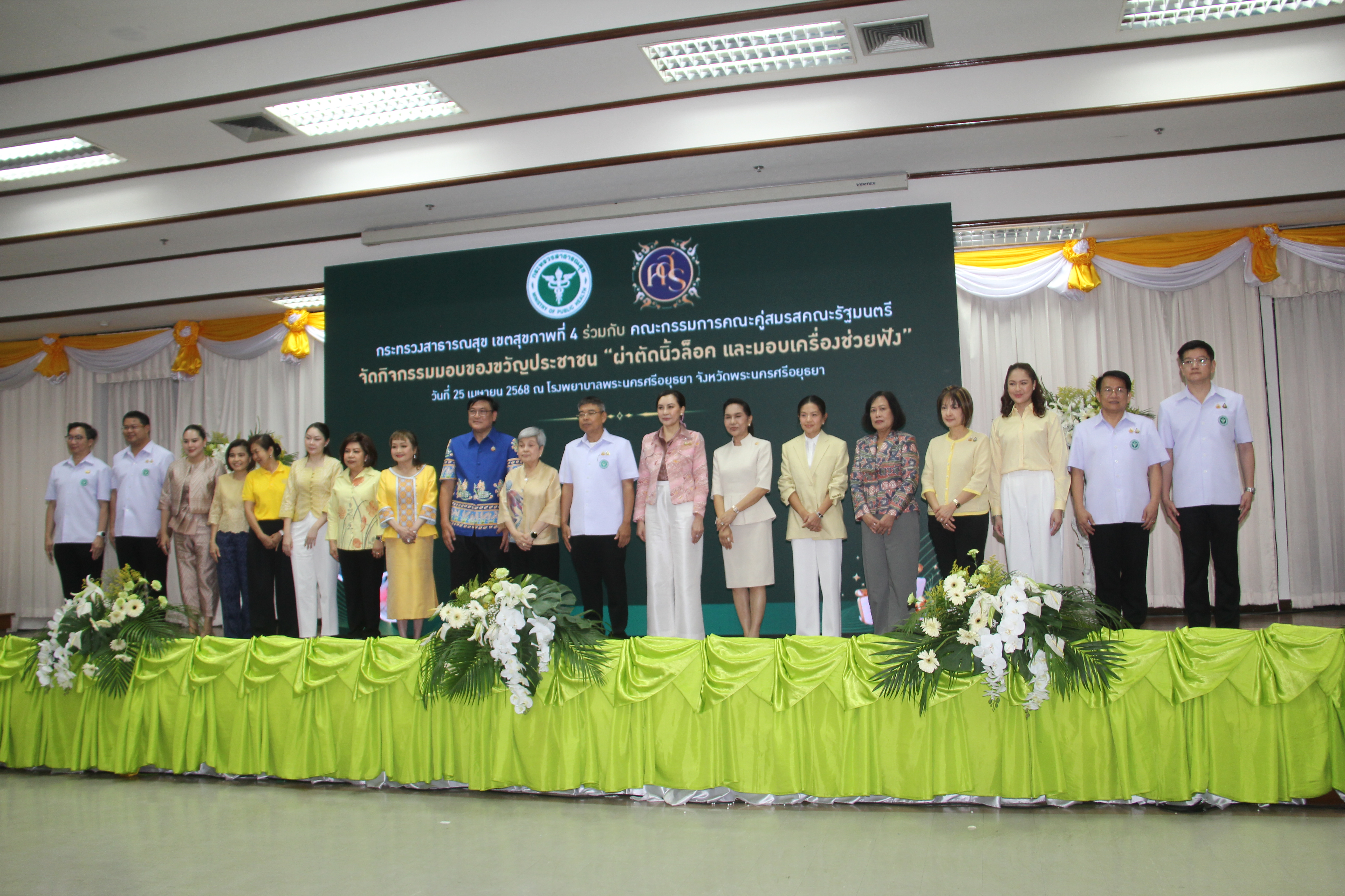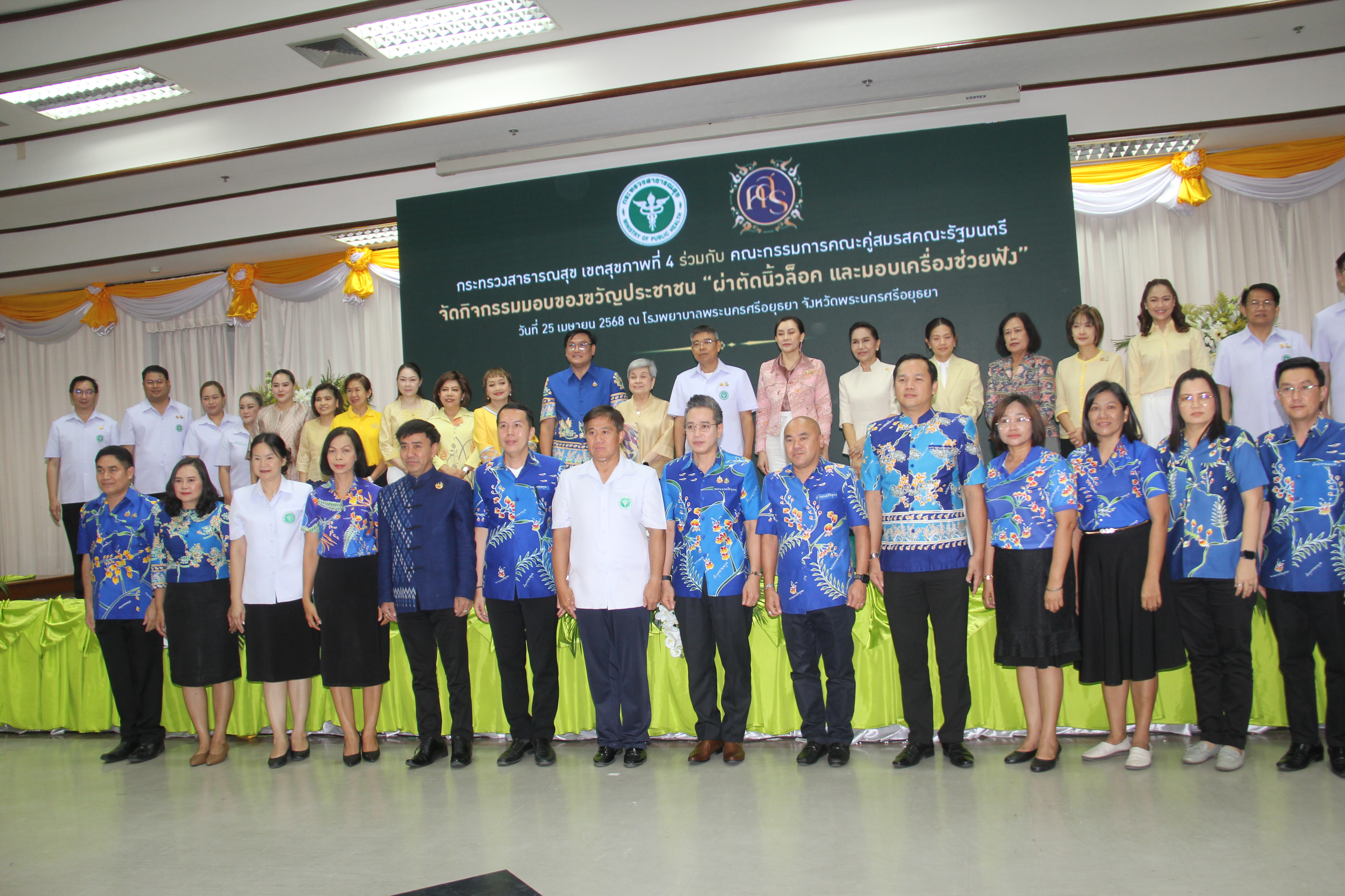 วันที่ 25 เมษายน 2568 เวลา 09.30 น. ณ ห้องประชุมอู่ทอง ชั้น 5 อาคารเฉลิมพระเกียรติ โรงพยาบาลพระนครศรีอยุธยา นางอภิญญา เวชยชัย รองประธานคณะกรรมการคณะคู่สมรสคณะรัฐมนตรี เป็นประธาน เปิดกิจกรรมของขวัญประชาชน ครั้งที่ 1โดยมีคณะกรรมการคณะคู่สมรสคณะรัฐมนตรี พ.ศ.2568 ประกอบด้วยนางสุริสา จึงรุ่งเรืองกิจ, นางอนงค์วรรณ เทพสุทิน, น.ส.สุภาพร กำเนิดผล, น.ส.สุทธาสินี สกุลคู, นางก่อกาญจน์ เสงี่ยมพงษ์, นางญาณิกา เทียนทอง, นางธัญยธรณ์ นริพทะพันธุ์, นางสุนีย์ สอดส่อง, นางวนิดา นาคพาณิชย์,นางวรัญญา โรจนสกุล, นางวีณา ศรีสรรพางค์ และนางอิสสริยา พันธ์เจริญวรกุล นายธีรศักดิ์ โฉมศิริ รองผู้ว่าราชการจังหวัดพระนครศรีอยุธยา หัวหน้าส่วนราชการ บุคลากรสาธารณสุขจังหวัดพระนครศรีอยุธยา และประชาชน เข้าร่วมกิจกรรม