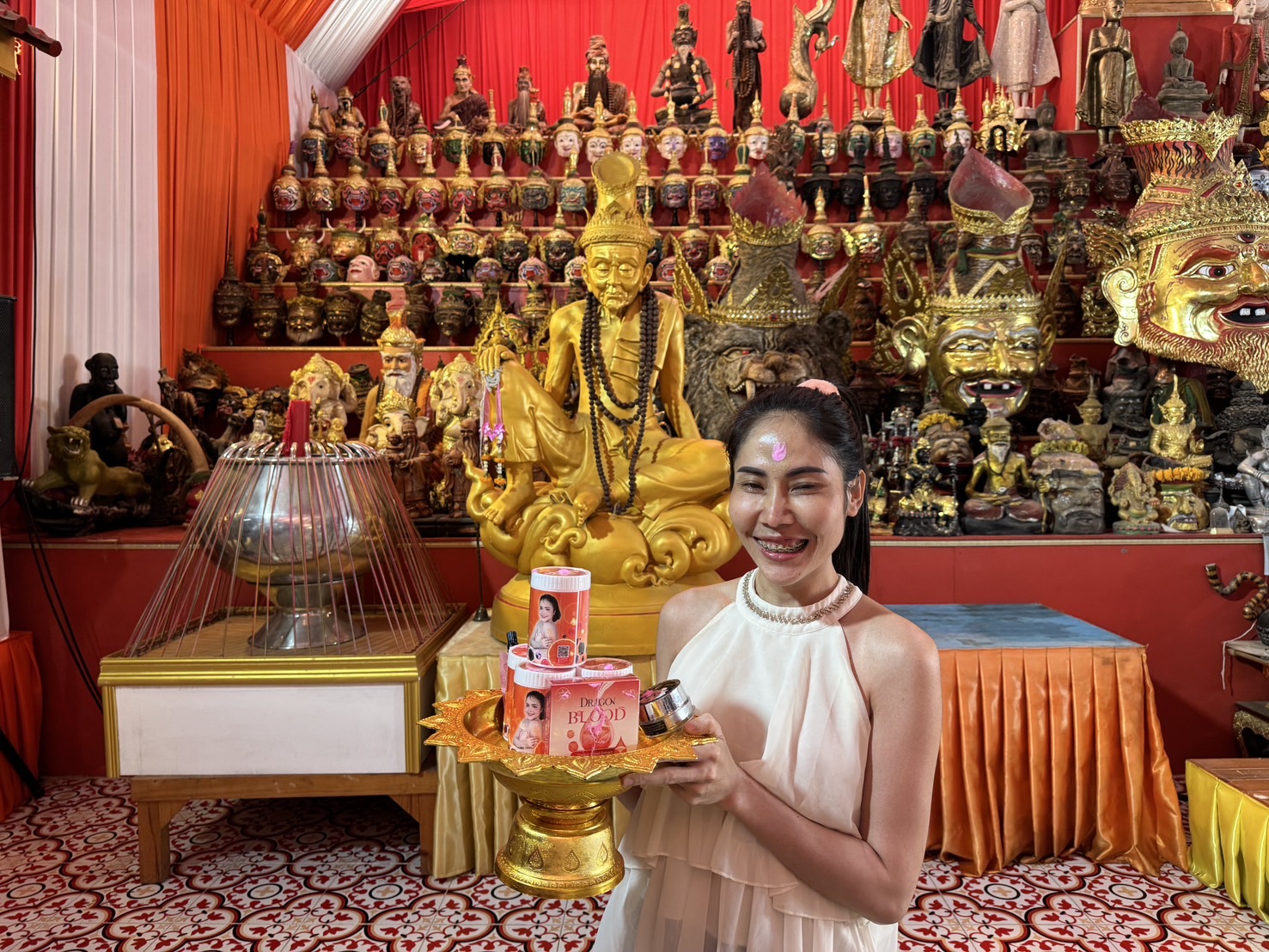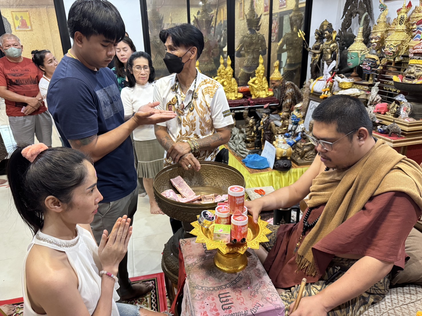 โดยวันนี้ได้มี น.ส.กุ้งนาง พรหมทัต แม่ค้าออนไลน์ชาวลาว อายุ 35 ปี ที่เดินทางมาจากประเทศลาวเพื่อให้อาจารย์ฤาษีเณร ธาตุพุทธคุณ ลง นะ พระลักษณ์หน้าทองและเจิมมือเปิดดวงเศรษฐีให้เพื่อความเป็นสิริมงคลและให้ยอดขายปังปัง โดย น.ส.กุ้งนาง ได้เดินทางมาทำพิธีแล้วกว่า 10 ครั้ง โดย น.ส.กุ้งนาง ได้กล่าวว่าตนเดินทางมาจากเมืองสวรรค์เขต สปป.ลาวโดยมาลง นะ พระลักษณ์หน้าทองและเจิมมือเปิดดวงเศรษฐีรอบนี้เป็นรอบที่ 10 แล้ว มาทุกครั้งก็ดีขึ้นทุกครั้ง ก็ได้ยอดขาย รอบนี้มาขอยอดขายอีก ได้ตามเป้าก็กลับมาอีก