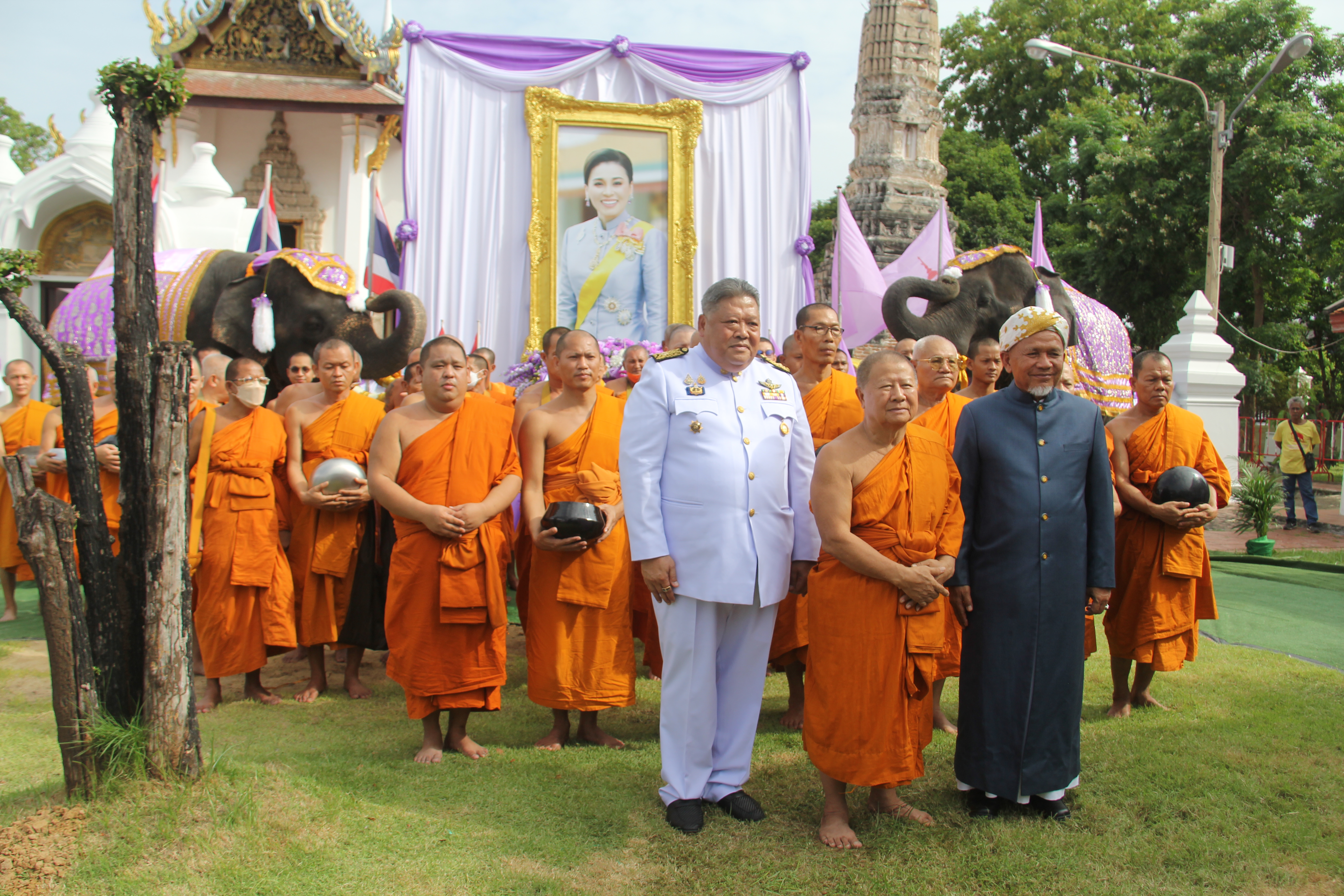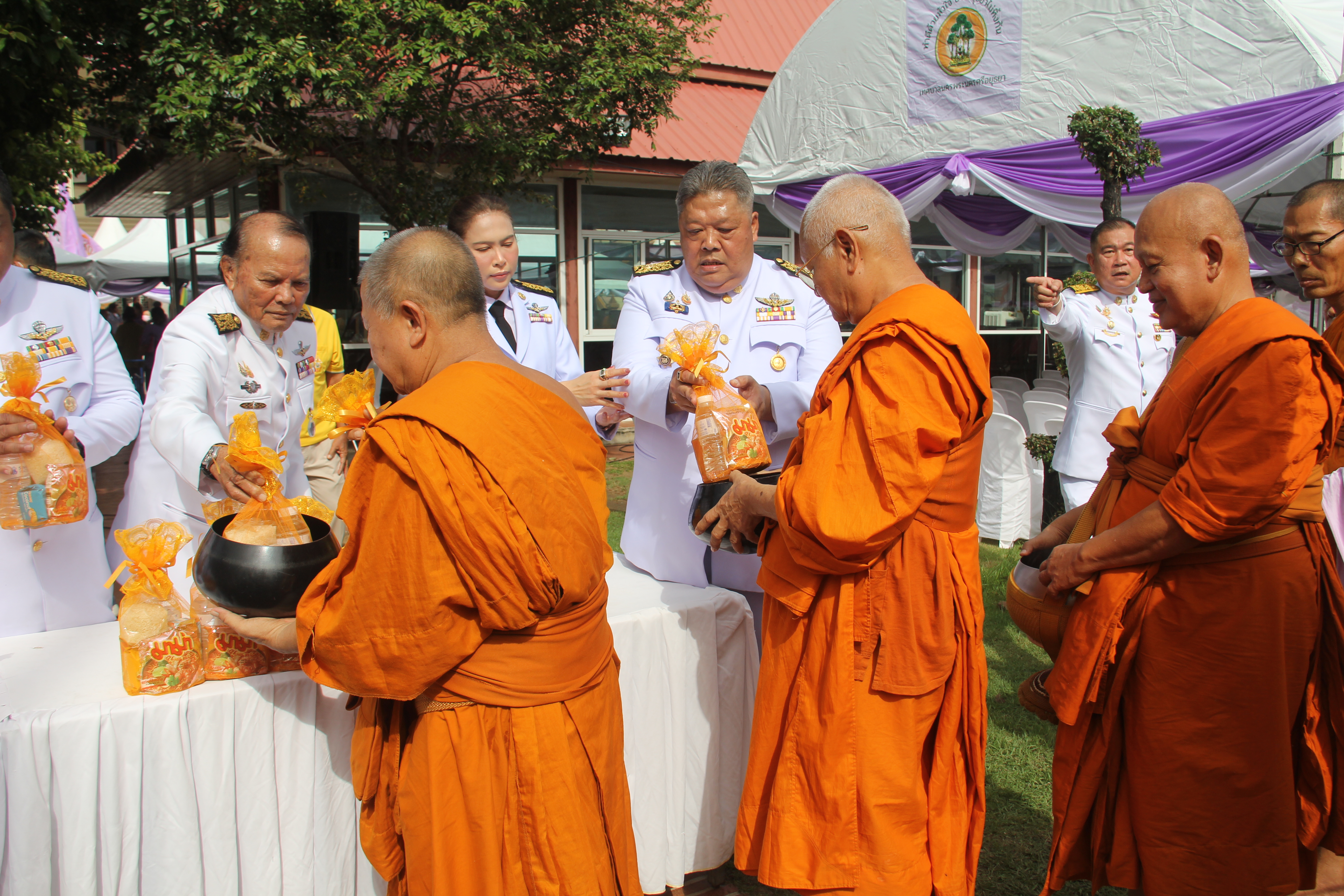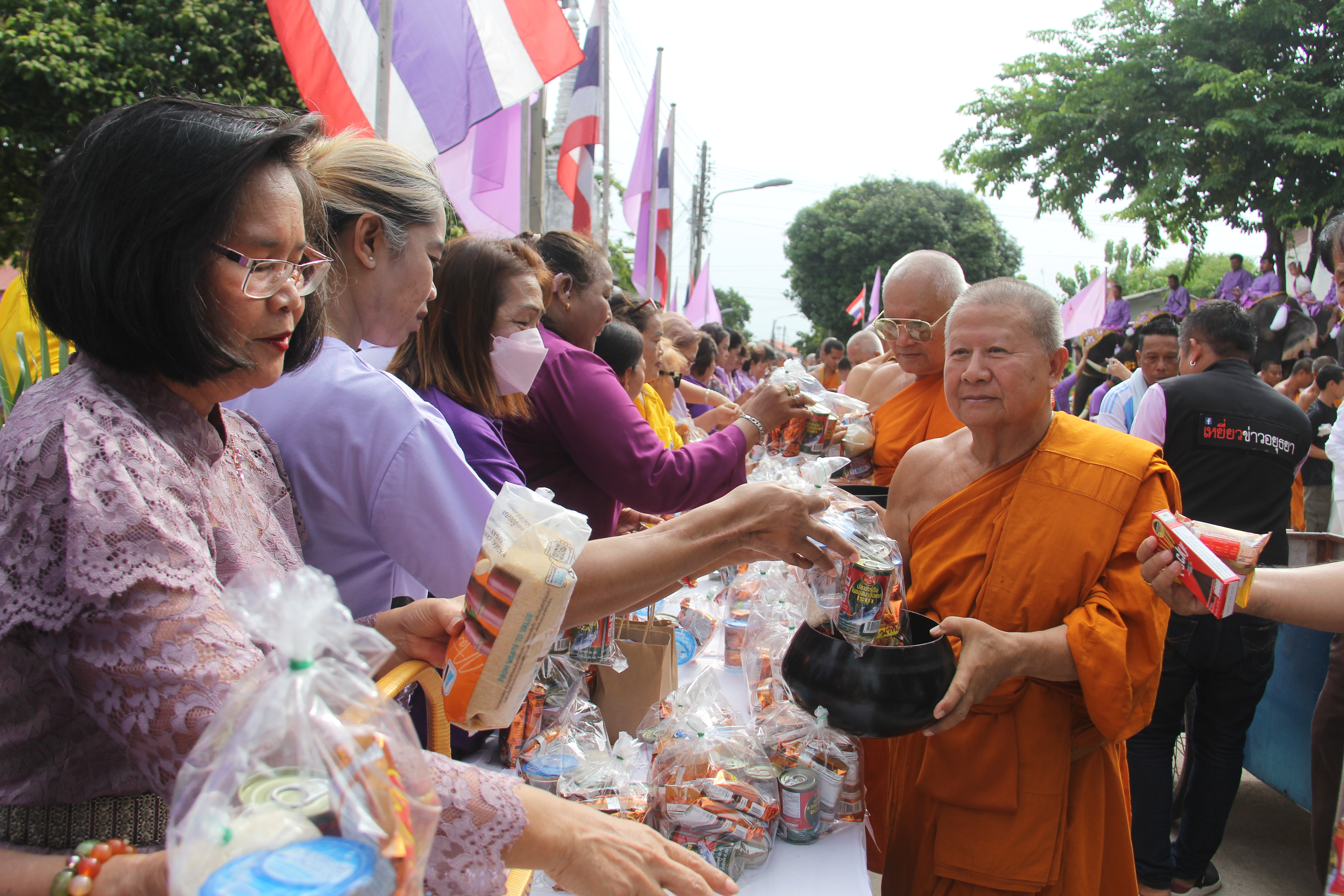 พระภิกษุสงฆ์ผู้ทรงสมณศักดิ์ ประกอบพิธีเจริญพระพุทธมนต์ จากนั้น ว่าที่ร้อยตรี ดร.สมทรง สรรพโกศลกุล นายกเทศมนตรีนครพระนครศรีอยุธยา พร้อมคณะผู้บริหาร วางพานพุ่มถวายพระพร ลงนามถวายพระพร นายประดิษฐ์ รัตนโกมล ประธานคณะกรรมการอิสลามประจำจังหวัดพระนครศรีอยุธยา ประกอบพิธีดูอาร์ขอพร พระวชิโรภาส เจ้าคณะอำเภอพระนครศรีอยุธยา เจ้าอาวาสวัดศาลาปูนวรวิหาร เป็นประธานฝ่ายสงฆ์ คณะสงฆ์ จำนวน 49 รูป ออกรับบิณฑบาต โดยมีช้างจากวังช้างอยุธยาแลเพนียด จำนวน 6 เชือกมาร่วมพิธี