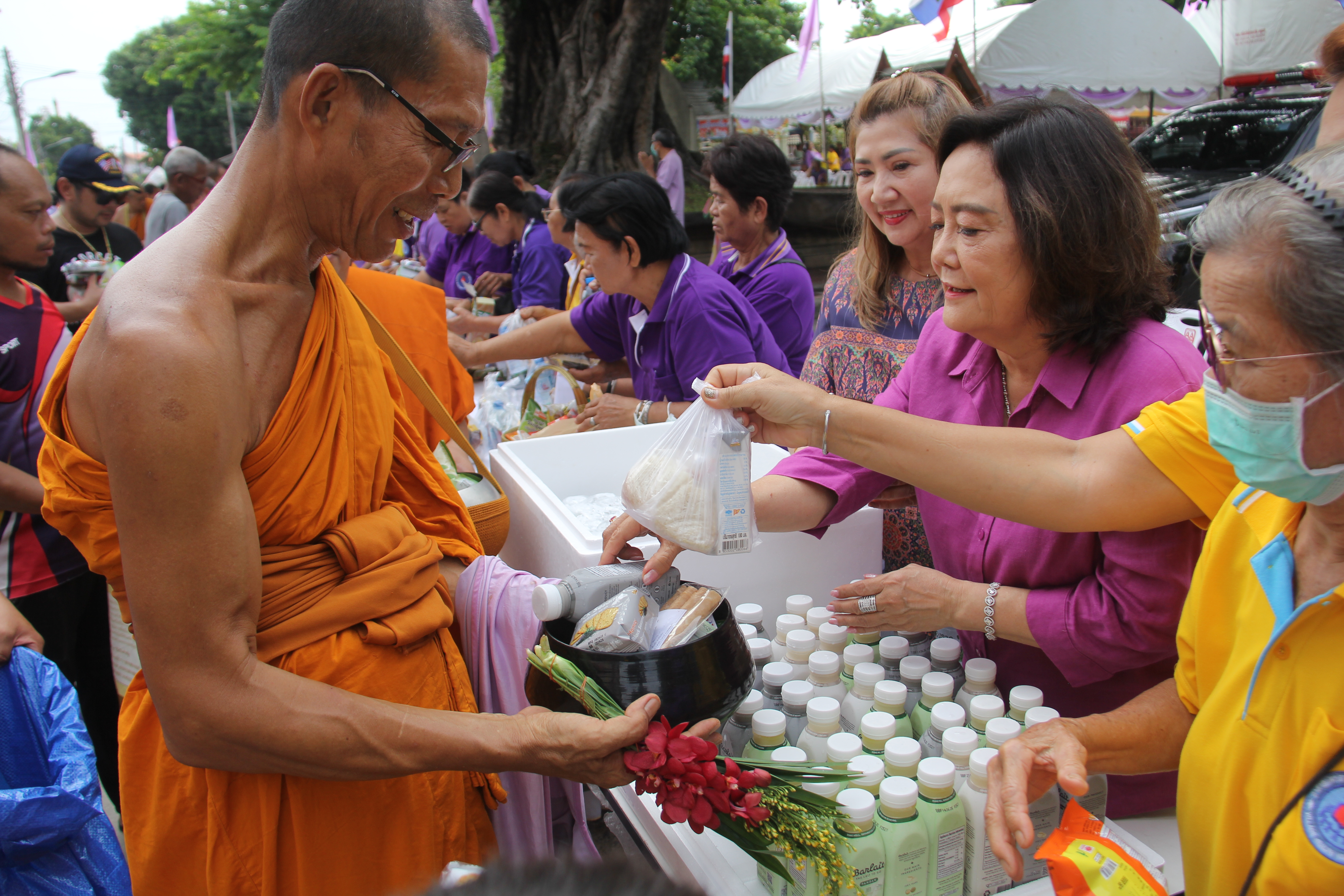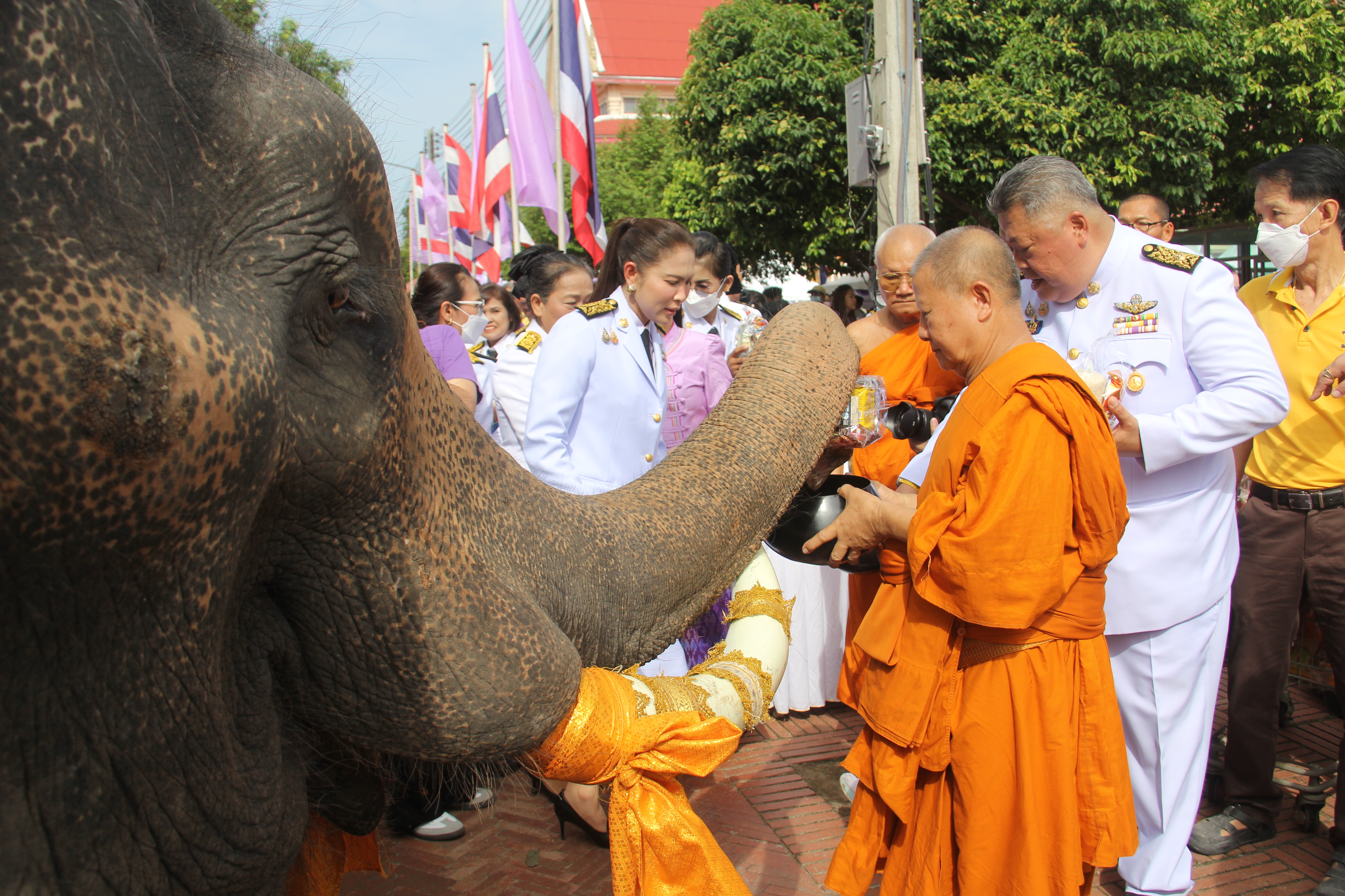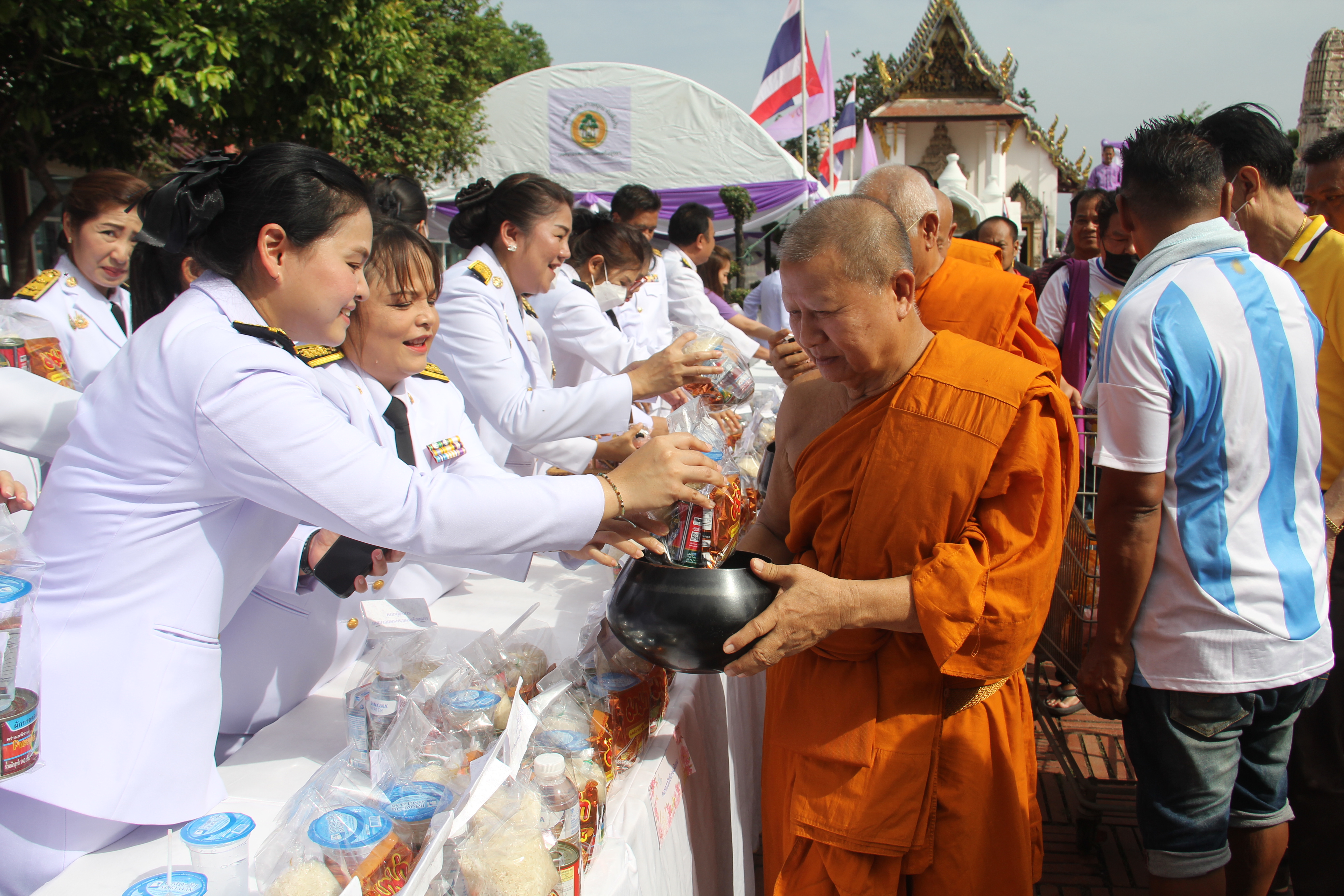 พระภิกษุสงฆ์ผู้ทรงสมณศักดิ์ ประกอบพิธีเจริญพระพุทธมนต์ จากนั้น ว่าที่ร้อยตรี ดร.สมทรง สรรพโกศลกุล นายกเทศมนตรีนครพระนครศรีอยุธยา พร้อมคณะผู้บริหาร วางพานพุ่มถวายพระพร ลงนามถวายพระพร นายประดิษฐ์ รัตนโกมล ประธานคณะกรรมการอิสลามประจำจังหวัดพระนครศรีอยุธยา ประกอบพิธีดูอาร์ขอพร พระวชิโรภาส เจ้าคณะอำเภอพระนครศรีอยุธยา เจ้าอาวาสวัดศาลาปูนวรวิหาร เป็นประธานฝ่ายสงฆ์ คณะสงฆ์ จำนวน 49 รูป ออกรับบิณฑบาต โดยมีช้างจากวังช้างอยุธยาแลเพนียด จำนวน 6 เชือกมาร่วมพิธี