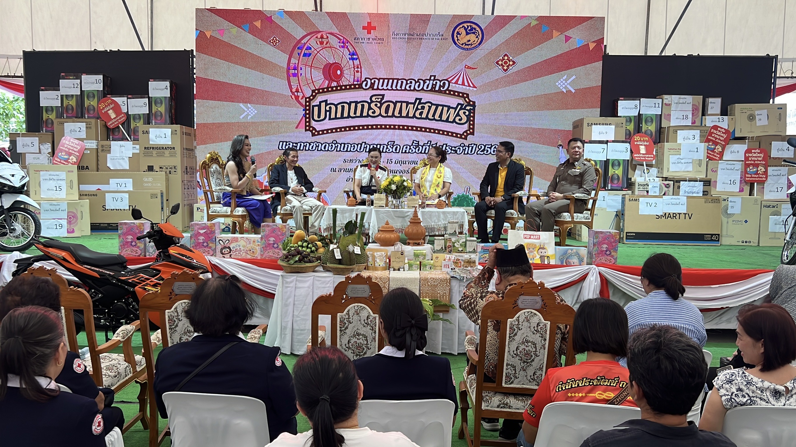 น.ส.ญาณิพัชญ์ ศรีโคตร นายอำเภอปากเกร็ด กล่าวว่า งาน “Pak Kret Fest Fair และงานกาชาดครั้งที่1 จัดขึ้นเพื่อนำรายได้จากการจำหน่ายมัจฉากาชาด ไปเป็นทุนการศึกษา สร้างบ้านผู้ยากไร้ ดูแลผู้พิการ ผู้ป่วยติดเตียงและผู้ยากไร้ โดยภายในงานมีกิจกรรมมากมาย อาทิ เชิญหลวงปู่เอี่ยม วัดสะพานสูง องค์จำลอง มาให้ประชาชนสักการะบูชาเพื่อความเป็นสิริมงคล