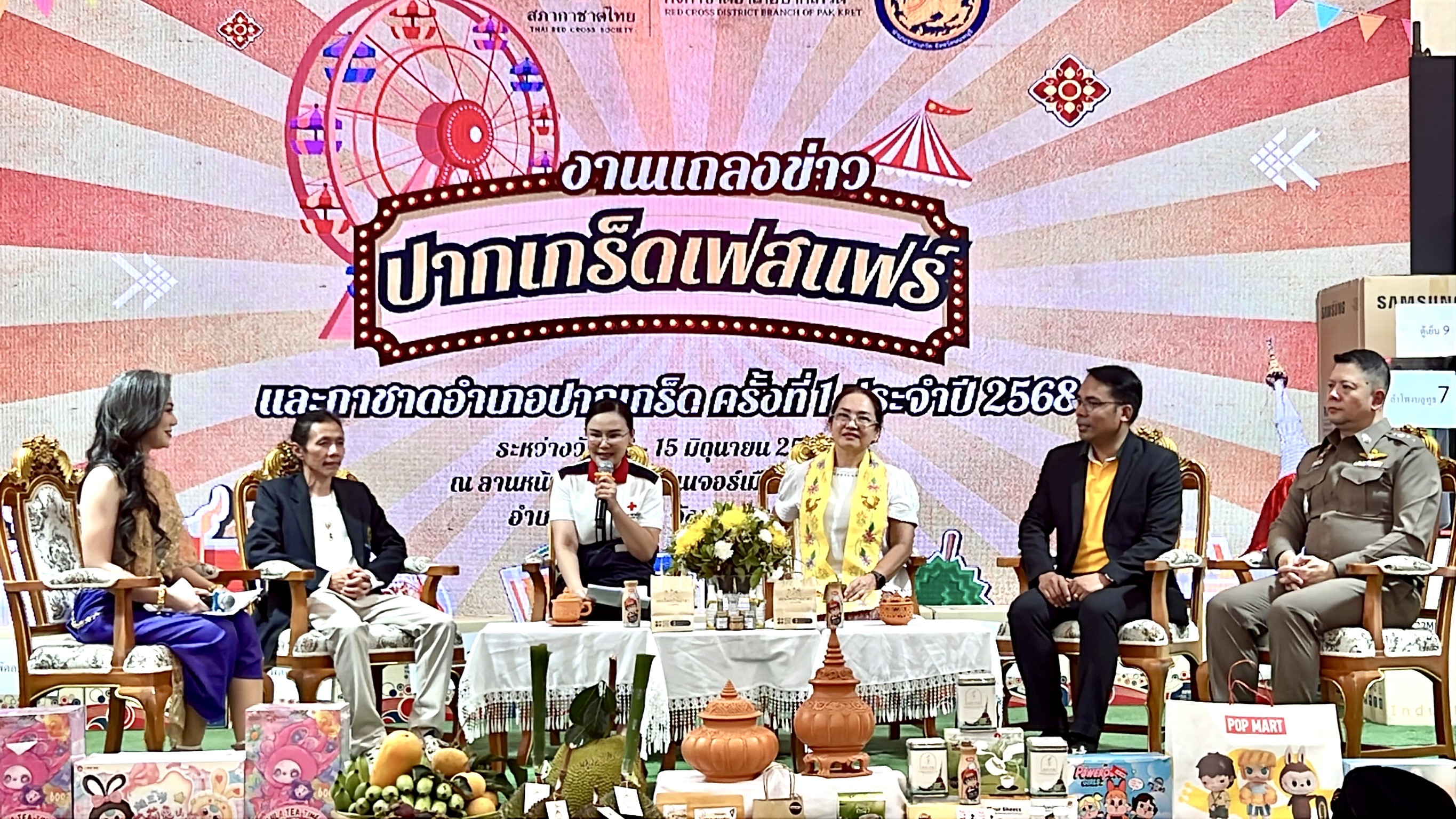 เมื่อเวลา 17.30 น.วันที่ 5 มิ.ย.2568 ที่หน้าอาคารอิมแพค ชาเลนเจอร์ เมืองทองธานี อ.ปากเกร็ด จ.นนทบุรี น.ส.ญาณิพัชร์ ศรีโคตร นายอำเภอปากเกร็ด พ.ต.อ.อภิศักดิ์ โชติกเสถียร ผกก.สภ.ปากเกร็ด นางปริญดา เชาว์อรัญ รองปลัดเทศบาล รักษาราชการแทนปลัดเทศบาล ปฎิบัติหน้าที่นายกเทศมนตรีนครปากเกร็ด นายทรงพล คำพันธ์ คณะกรรมการและที่ปรึกษาสมาคมพระเครื่องพระบูชาไทย ได้ร่วมกันแถลงข่าวการจัดงาน “Pak Kret Fest Fair และงานกาชาดปากเกร็ดครั้งที่1 ประจำปี 2568 โดยจัดขึ้นที่บริเวณลานหน้าอาคารอิมแพค ชาเลนเจอร์ เมืองทองธานี อ.ปากเกร็ด จ.นนทบุรี