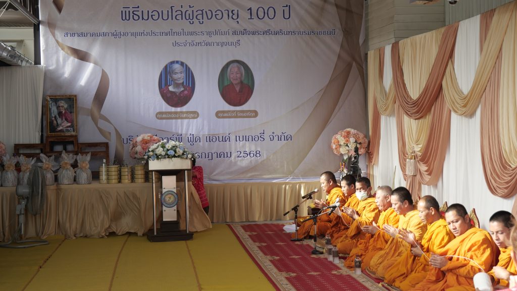 วันที่ 8 กรกฎาคม 2568 เวลา 10.00 น. ที่บริษัท ปั้นคำหอม เทรดดิ้ง จำกัด ตำบลหวายเหนียว อำเภอท่ามะกา จังหวัดกาญจนบุรี นายอธิสรรค์ อินตรา ผู้ว่าราชการจังหวัดกาญจนบุรี เป็นประธานในพิธีมอบโล่เชิดชูเกียรติผู้สูงอายุที่มีอายุครบ 100 ปี โดยมีนางสาวกิตติยา จึงรุ่งเจริญกิจ นายกเหล่ากาชาดจังหวัดกาญจนบุรี นางอรทัย วงศ์วัชรมงคล นายอำเภอท่ามะกา หัวหน้าส่วนราชการ และสมาชิกเหล่ากาชาดจังหวัดกาญจนบุรี ร่วมพิธีอย่างพร้อมเพรียง