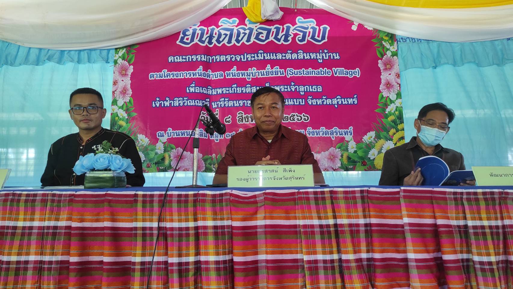 เมื่อเวลา 13.30 น. วันที่ 8 สิงหาคม 2566 ผู้สื่อข่าวรายงานว่า ที่บริเวณศาลาชุมชนกลางหมู่บ้าน หนองสิม หมู่ 14 ต.บะ อ.ท่าตูม จ.สุรินทร์ นายสรสาสน์ สีเพ็ง รองผู้ว่าราชการ จ.สุรินทร์ พร้อมด้วยคณะกรรมการจากหน่วยงานต่างๆของจังหวัดสุรินทร์จำนวน 6 นาย ได้เดินทางมาที่บ้านหนองสิม หมู่ที่ 14 ต.บะ อ.ท่าตูม จ.สุรินทร์ เพื่อทำการประเมินหมู่บ้านหนองสิม ที่ได้รับการคัดเลือกจาก ทาง อ.ท่าตูม ให้เป็นต้นแบบของหมู่บ้านยั่งยืน โดยมี นาย รองรัตน์ จงอุตส่าห์ นายอำเภอท่าตูม พร้อมด้วย นายกองค์การบริหารตำบลบะ กำนัน ผู้ใหญ่บ้านสมาชิกองค์การบริหารส่วนตำบล คณะครูนักเรียนโรงเรียน บ้านโนนสูง และพี่น้องประชาชนชาวหนองสิม คอยให้การต้อนรับ