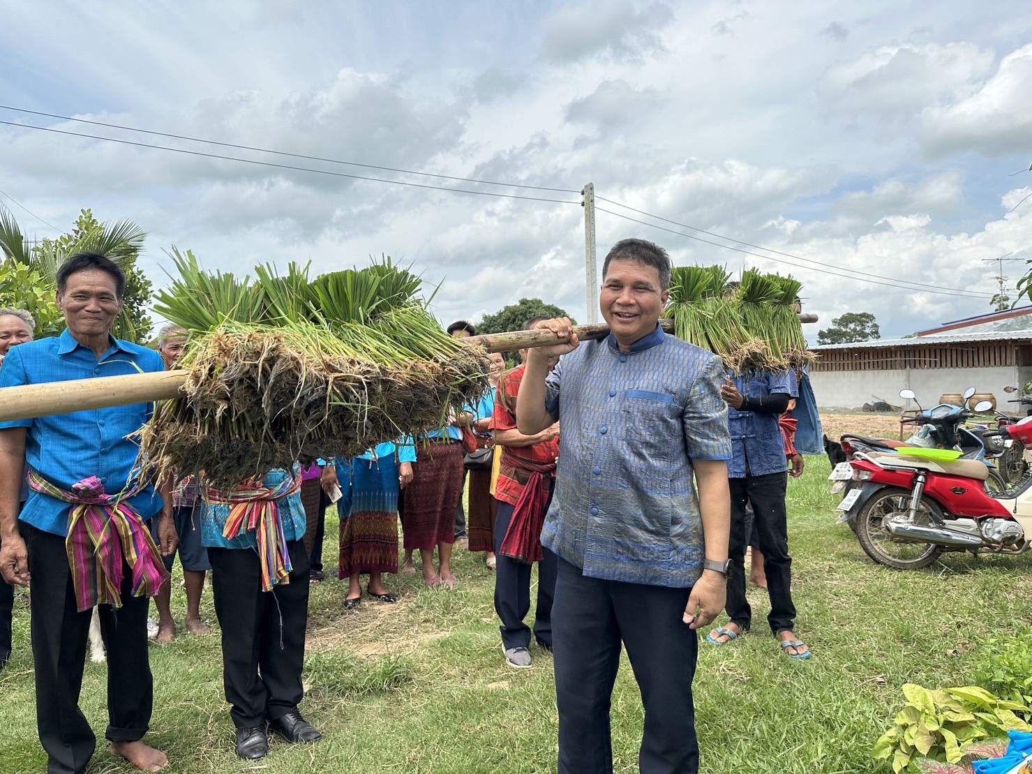 เมื่อเวลา 13.00 น. วันนี้ ( 8 สิงหาคม 2566) นายกานต์ กาญจนวงศ์สกุล นายอำเภอรัตนบุรี และ ดร.ดุษฎี ดวงใจ ปลัดอำเภอ หัวหน้ากลุ่มงานบริหารงานปกครอง พร้อมด้วยหัวหน้าส่วนราชการ ท่านพระครูผาสุกิจ โสภณ เจ้าคณะตำบลธาตุ นายกองค์การบริหารส่วนตำบลหนองบัวบาน กำนัน ผู้ใหญ่บ้าน และ ชาวบ้านหนองบัวบาน ได้ร่วมกันเดินทางไปยังที่นาของ นายสีลา ประดาสุข ซึ่งเป็นไร่นาสวนผสมจำนวน 5 ไร่ ที่บริเวณทุ่งนา ม. 15 บ้านหนองบัวบาน ต.หนองบัวบาน อ.รัตนบุรี จ.สุรินทร์ เพื่อร่วมกันทำกิจกรรม “ดำนาวันแม่ เกี่ยววันพ่อ “ เพื่อเฉลิมพระเกียรติ สมเด็จพระนางเจ้าสิริกิติ์ พระบรมราชินีนาถ พระบรมราชชนนีพันปีหลวง เนื่องในโอกาสวันเฉลิมพระชนมพรรษา 12 สิงหา ที่ใกล้จะมาถึงนี้ อีกทั้งยังเป็นการร่วมกันอนุรักษ์ประเพณีวัฒนธรรมการลงแขกดำนาปีในท้องถิ่น ส่งเสริมการเรียนรู้การทำนาแบบวิถีชีวิตดั้งเดิมให้คงอยู่สืบไป