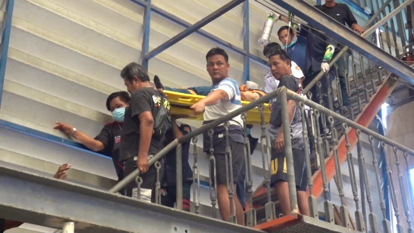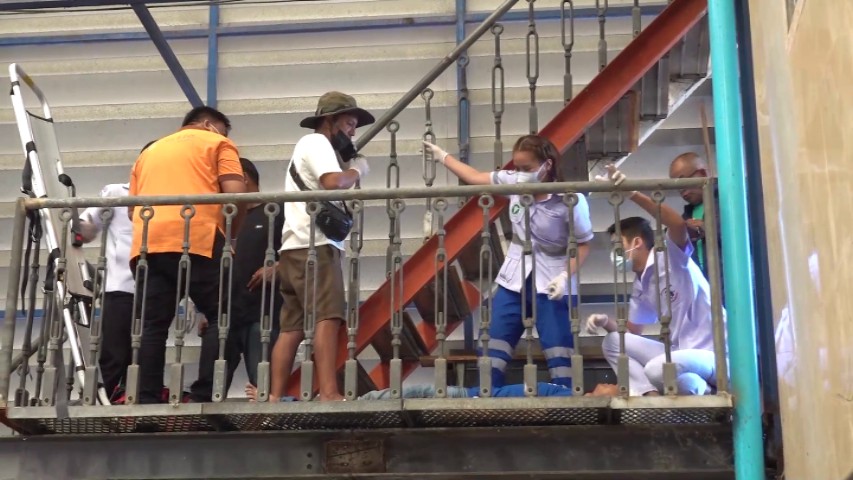 นี่เป็นภาพวงจรปิดเมื่อเวลา 11.30 น. วันที่ 26 มี.ค. 66 ภายในบริษัท ฟู่อี้ อิเล็คทรอนิคส์ แอนด์ พลาสติก รีไซเคิล จำกัด เลขที่ 41/3 หมู่ 16 ต.บางปะกง อ.บางปะกง จ.ฉะเชิงเทรา จับภาพขณะที่ น.ส.ชญานิศ พรมลือ อายุ 39 ปี ภรรยาของนายภูมิพัฒน์ แก้ววรากาญจน์ อายุ 39 ปี เจ้าของบริษัท กำลังเรียกลูกน้องที่ทำงานอยู่ด้านล่างขึ้นบันไดไปที่ออฟฟิชชั้น 3 เพื่อไปช่วยแย่งปืนจากนายภูมิพัฒน์ ที่นำปืนออกมาแล้วจะยิงตัวเอง ช่วงจังหวะที่ น.ส.ชญานิศ เข้าไปล็อคตัว