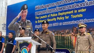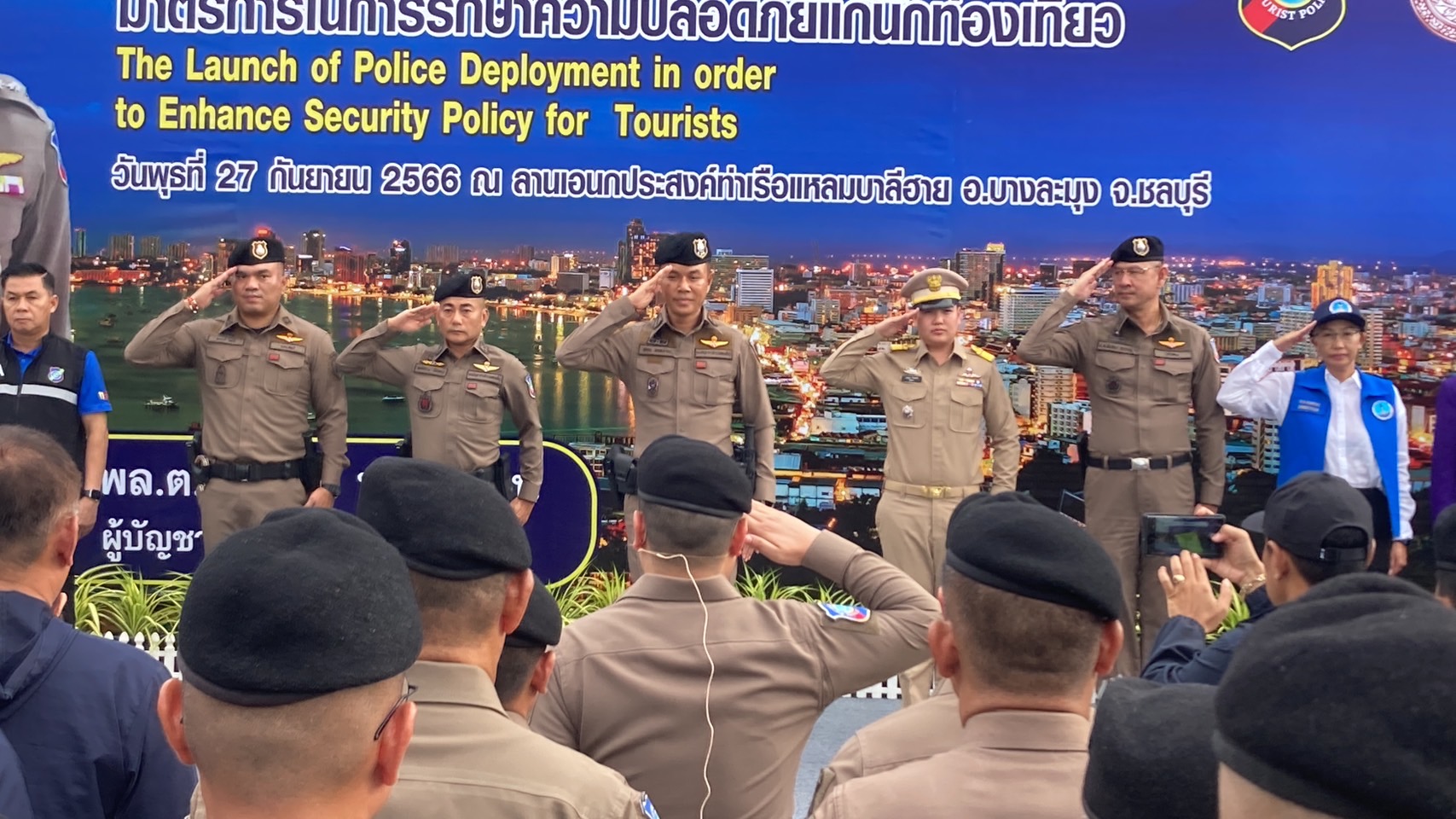 เวลา 16.30 น.วันที่ 27 ก.ย.66 ที่ลานอเนกประสงค์ ท่าเทียบเรือท่องเที่ยวพัทยา (บาลีฮาย) จ.ชลบุรี พล.ต.ท.สุคุณ พรหมายน ผู้บัญชาการตำรวจท่องเที่ยว ได้เดินทางมาเป็นประธานปล่อยแถวระดมกวาดล้างอาชญากรรมเพื่อยกระดับมาตรการในการรักษาความปลอดภัยแก่นักท่องเที่ยว โดยมีหน่วยงานที่เกี่ยวข้องเข้าร่วมอย่างพร้อมเพรียง