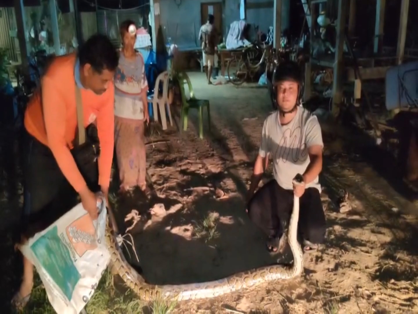 ต่อมาเจ้าหน้าที่กู้ชืพ พร้อมอุปกรณ์จับอสรพิษ ได้เดินทางเข้าให้การช่วยเหลือ จุดเกิดเหตุเป็นบ้านไม้สองชั้นติดกับุทุ่งนา เลขที่ 51 หมู่ที่ 6 ตำบลบ้านแร่ อำเภอเขวาสินรินทร์ จังหวัดสุรินทร์ ข้างบ้านมีเล้าไก่ พบงูเหลือมขนาดใหญ่ ความยาวกว่า 4 เมตร ขนาดลำตัวเท่าท่อนขา อยู่ในสภาพตัวติดคาอยู่กับร่องหลังคาเล้าไก่ ต้องใช้ความระมัดระวังในการช่วยเหลือ เพราะเกรงว่างูอาจถูกคมแผ่นสังกะสีบาดได้ กู้ชืพต้องใช้เวลากว่า 20 นาที จึงสามารถช่วยเหลืองูเหลือม นำตัวออกมาได้อย่างปลอดภัย ก่อนนำปล่อยคืนสู่ธรรมชาติ