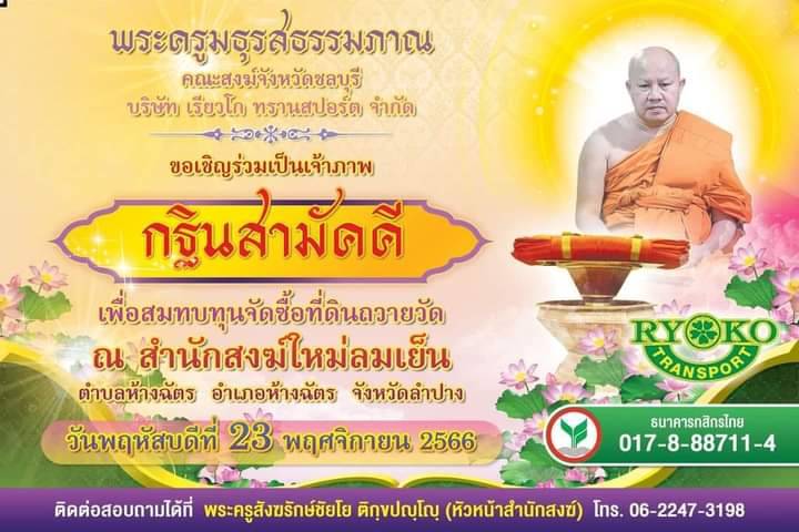 พระครูมธุรสธรรมภาณ(หลวงพ่อน้ำหอม) เจ้าอาวาสวัดรังษีสุทธาวาส(ไร่กล้วย) รองเจ้าคณะอำเภอศรีราชา รูปที่ 2 ประธานสภาสงฆ์ชลบุรี ขอเรียนเชิญพุทธศาสนิกชนชาวพุทธผู้ใจบุญ ร่วมเป็นเจ้าภาพทำบุญซื้อที่ดินถวายวัด ทอดกฐินสามัคคีทอดถวาย ณ สำนักสงฆ์ใหม่ลมเย็น ( ศูนย์ปฏิบัติธรรมสาขาวัดรังษีสุทธาวาส ) ตำบลห้างฉัตร อำเภอห้างฉัตร จังหวัดลำปาง ในวันพฤหัสบดีที่ 23 พฤศจิกายน พุทธศักราช 2566 เวลา09.00น. แห่องค์กฐินและทอดกฐิน
