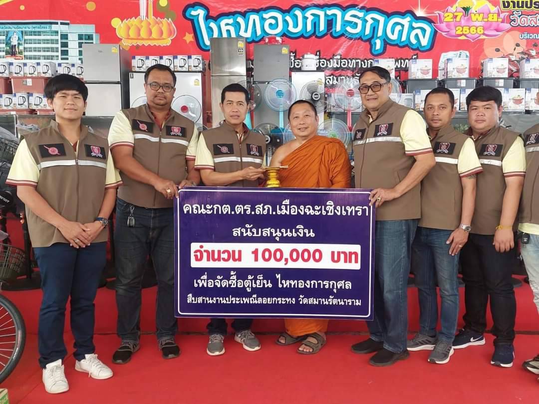 วันที่ 24 พ.ย.66 นายประชา คล้ายสิงห์ ที่ปรึกษาตำรวจภูธรภาค2 /ประธาน กต.ตร.สภ.เมืองฉะเชิงเทรา ผู้ใหญ่มานัส โท้เป๋า ประธานที่ปรึกษา กต.ตร. และคณะกต.ตร.สภ.เมืองฉะเชิงเทรา มอบเงิน 100,000 บาท แด่ เจ้าคุณพระประชาธรรมนาถ เจ้าคณะจังหวัดฉะเชิงเทรา (ธ) เจ้าอาวาสวัดสมานรัตนาราม เพื่อร่วมกิจกรรมล้วงไหทองการกุศล วันลอยกระทง วัดสมานรัตนาราม อ.เมืองฉะเชิงเทรา รายได้จัดซื้อเครื่องมือแพทย์ รพ.วัดสมานรัตนาราม