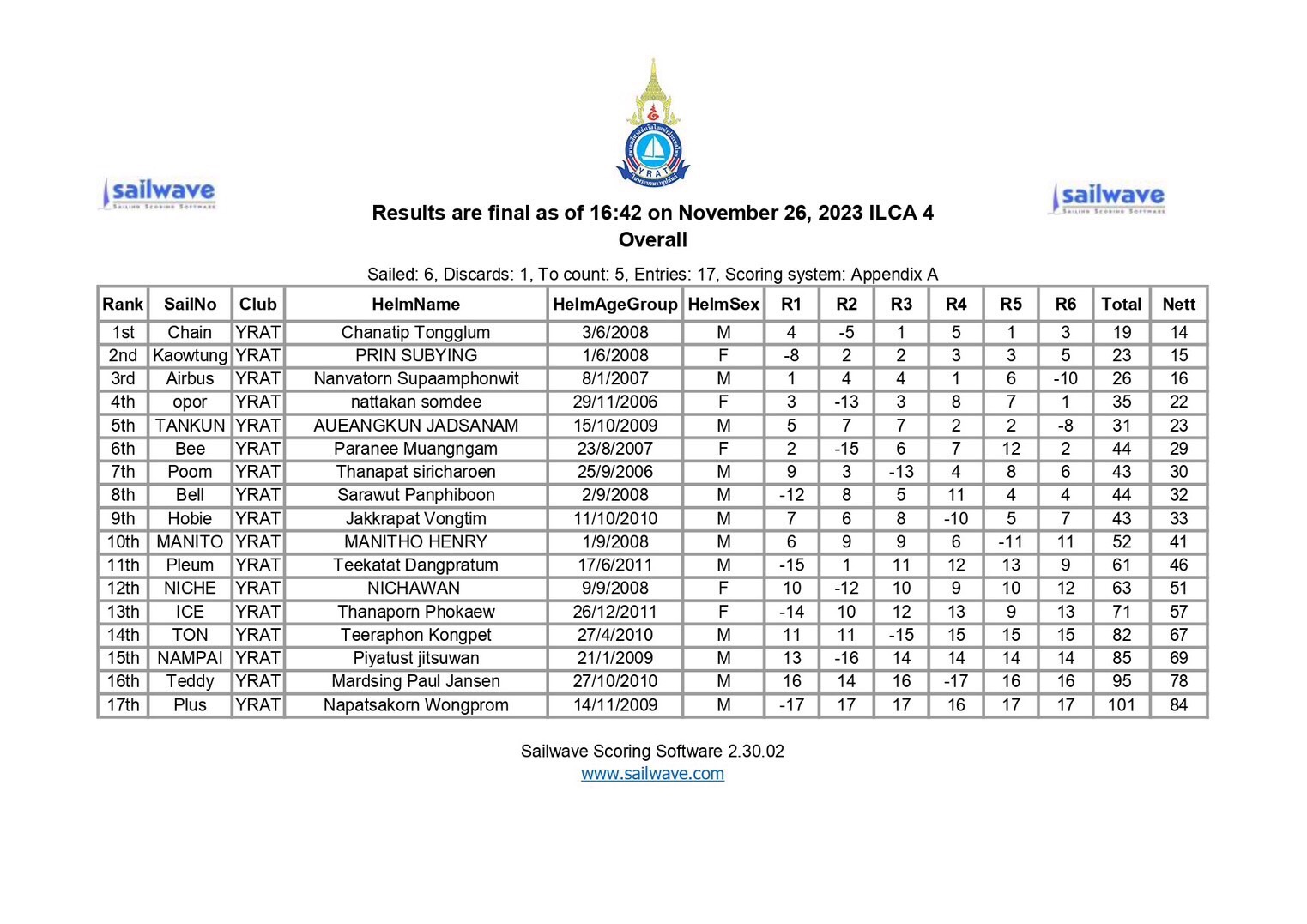 บัดนี้การแข่งขันได้จบลงเป็นที่เรียบร้อยนายชนาธิป ทองกล่ำ นักโรงเรียนพลูตาหลวงวิทยาสามารถชนะเลิศรายการแข่งขันเรือใบประเภทเรือใบILCA4ในการแข่งขัน ดังกล่าวและยังสร้างชื่อเสียงให้กับโรงเรียนพลูตาหลวงวิทยา ในฐานะนักเรียนของโรงเรียนพลูตาหลวงวิทยาที่เข้าร่วมในกิจกรรมการแข่งขันอีกด้วย