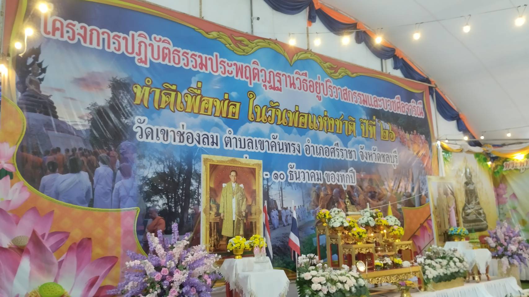 เมื่อเวลา17.30น.วันที่5ธันวาคม ที่วัดเขาช่องลม ต.เขาคันทรง อ.ศรีราชาจ.ชลบุรี พระครูปลัดวัณณวัฒน์ กิตฺติธโร เจ้าอาวาสวัดเขาช่องลม ได้จัดให้ พระภิกษุร่วมประพฤติวุฏฐานวิธี อยู่ปริวาสกรรมและ อุบาสก-อุบาสิกา ร่วมบวชศีลจาริณี (ชีพราหมณ์) ปฏิบัติธรรมทำดีเพื่อพ่อ ในวันพ่อแห่งชาติ สร้างบารมีถวายเป็นพระราชกุศลแด่ พระบาทสมเด็จพระบรมชนกาธิเบศร มหาภูมิพลอดุลยเดชมหาราช บรมนาถบพิตร ในหลวง รัชกาลที่ 9 โดยร่วมกันสวดมนต์ทำวัตรเย็น เจริญจิตภาวนา นั่งสมาธิ ถวายเป็นพระราชกุศลแด่พระองค์ท่าน
