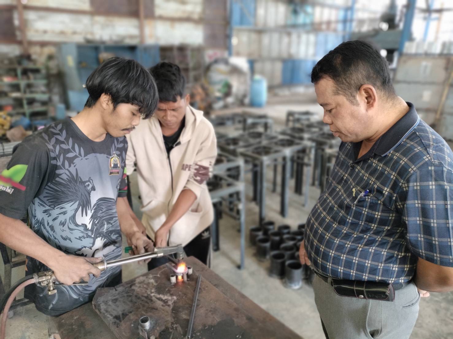 ทันทีที่เข้าไปภายในหลังบ้าน ที่มีการทำอาคารเฉพาะ พบท่านนายกฯกัมปนาท ชูสุวรรณ กำลังควบคุมการผลิตเตา ที่มีลักษณะคล้ายเตาแก๊สที่มีใช้ทั่วไปตามบ้านเรือน ร้านอาหารตามสั่ง ทราบว่า ท่านนายกฯกัมปนาท มุ่งมั่นที่อยากให้ชาวบ้านทั้งตำบลเกาะขนุนได้มีทางเลือกในการที่จะมีคุณภาพชีวิตที่ดีมีรายได้หมุนเวียน จึงได้ทำโครงการดังกล่าวขึ้น โดยกองสาธาณสุข อบต.เกาะขนุน จากเดิมทำเตากำจัดขยะพลาสติกแปลงเป็นน้ำมันดีเซล(พลังงานทดแทน) จนมีการตอบรับจากทุกหน่วยงาน จนต่อยอดด้วยการผลิตเตาที่ต่อไปชาวบ้านไม่ต้องใช้แก้สแล้ว เพราะจะสามารถนำน้ำมันจากขยะพลาสติก และน้ำมันพืชที่แต่ละครัวเรือนใช้ทอดอาหารจะได้ไม่ต้องทิ้ง แต่สามารถนำกลับมาใช้ร่วมกับน้ำมันที่ผลิตจากขยะพลาสติกได้