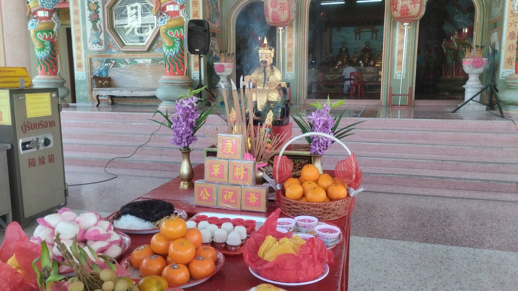 ซึ่งเป็นเทพเจ้าองค์แรกที่นำมาไว้ในศาลเจ้า ซึ่งพุทธสมาคมสัจจะธรรมสงเคราะห์ พ้งไล้ซาจับซาเซียวเกาะ โรงเจบึงไร่ 1 ได้จัดโต๊ะจีนมาถวายองค์เทพเจ้าในวันเทวะสมภพ(วันเกิด)ติดต่อกันมากว่า 10 ปีแล้ว โดยอาหารโต๊ะจีนจะมีอาหารคาว-หวานรวม 9 อย่างพร้อมเครื่องดื่ม โดยก่อนพิธีถวายโต๊ะจีนองค์เทพเจ้า ได้นิมนต์พระสงฆ์จำนวน 9 รูปมาฉันภัตราหารเพลเพื่อความเป็นสิริมงคลแก่ผู้ที่มาร่วมงานและได้มีพิธีไหว้หลวงเตี่ยโดยมีนายชัยจิตร รัฐขจร ประธานมูลนิธิสหพุทธะรรมสงเคราะห์พ้งเลี้ยงแห่งประเทศไทย เป็นประธานในพิธีสักการะ หลังเสร็จพิธีถวายโต๊ะจีนองค์เทพเจ้าแล้ว องค์หลวงเตี่ยเจียงกุงเอี้ย ก็ได้ประทับทรงให้พรแก่ผู้ที่มาร่วมกันจัดถวายโต๊ะจีนแก่องค์ท่านเนื่องในวันเทวะสมภพ และผู้คนที่มาร่วมงานต่างแห่ส่องเลขหางประทัดที่จุดถวายหลวงเตี่ยในวันเทวะสมภพได้แก่เลข 558-70 161-11ซึ่งจะนำไปซื้อสลากกินแบ่งรัฐบาลงวดวันที่17มกราคม 2567ที่จะถึงนี้หวังมีโชคจากหลวงเตี่ยกัน