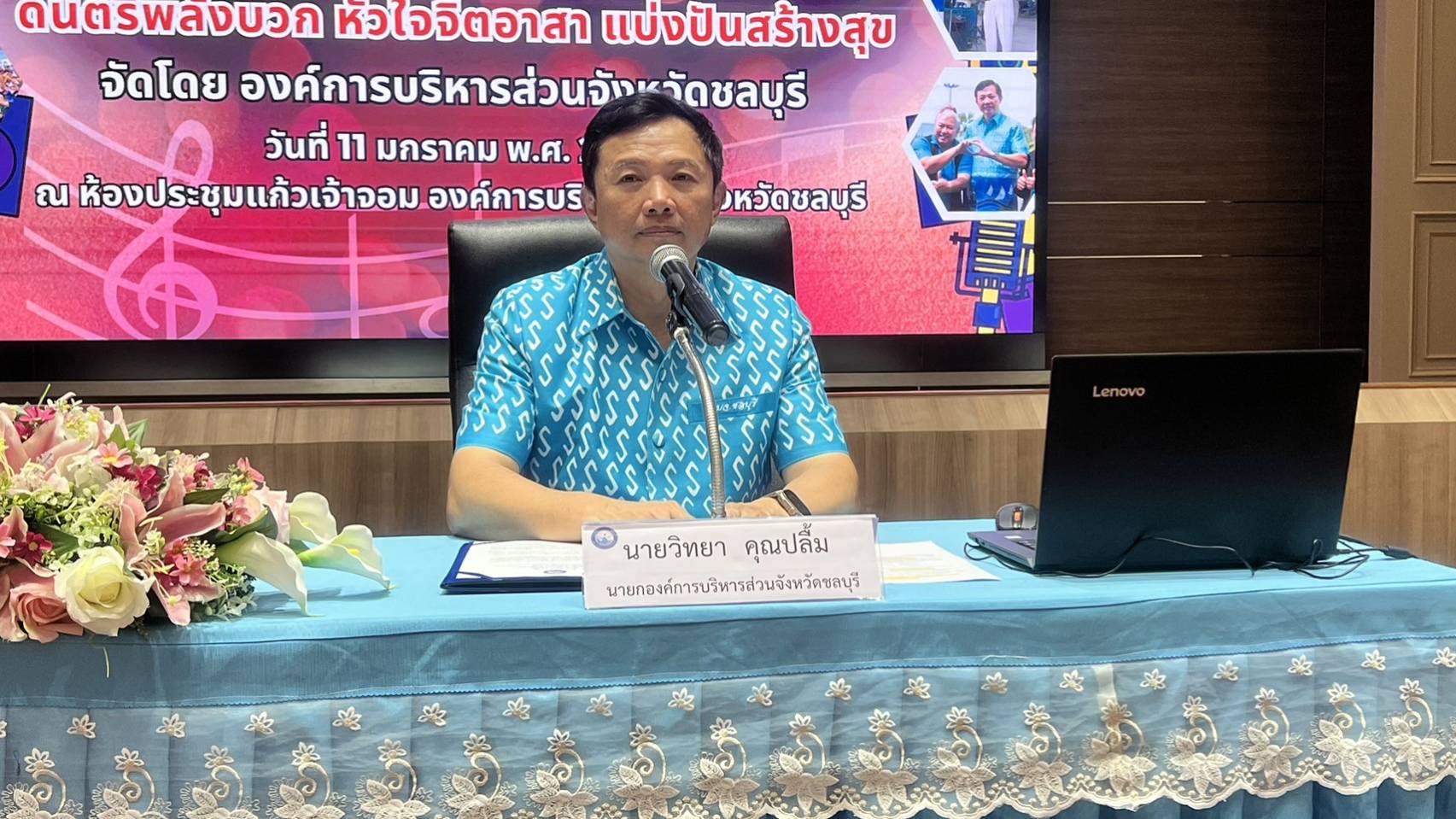 ที่ห้องประชุมแก้วเจ้าจอม องค์การบริหารส่วนจังหวัดชลบุรี นายวิทยา คุณปลื้ม นายกองค์การบริหารส่วนจังหวัดชลบุรี กล่าวเปิดโครงการ “สัมมนาเชิงปฏิบัติการดนตรีพลังบวก หัวใจจิตอาสา แบ่งปันสร้างสุข” โดยมีนายเอกรัตน์เมนะคงคาประธานเครือข่ายผู้สูงอายุองค์การบริหารส่วนจังหวัดชลบุรีในนามของคณะทำงานโครงการ”สัมมนาเชิงปฏิบัติการดนตรีพลังบวกหัวใจจิตอาสาแบ่งปันสร้างสุข”คณะผู้บริหารองค์การบริหารส่วนจังหวัดชลบุรี หน่วยงานราชการ และเครือข่ายผู้สูงอายุ เข้าร่วมโครงการ