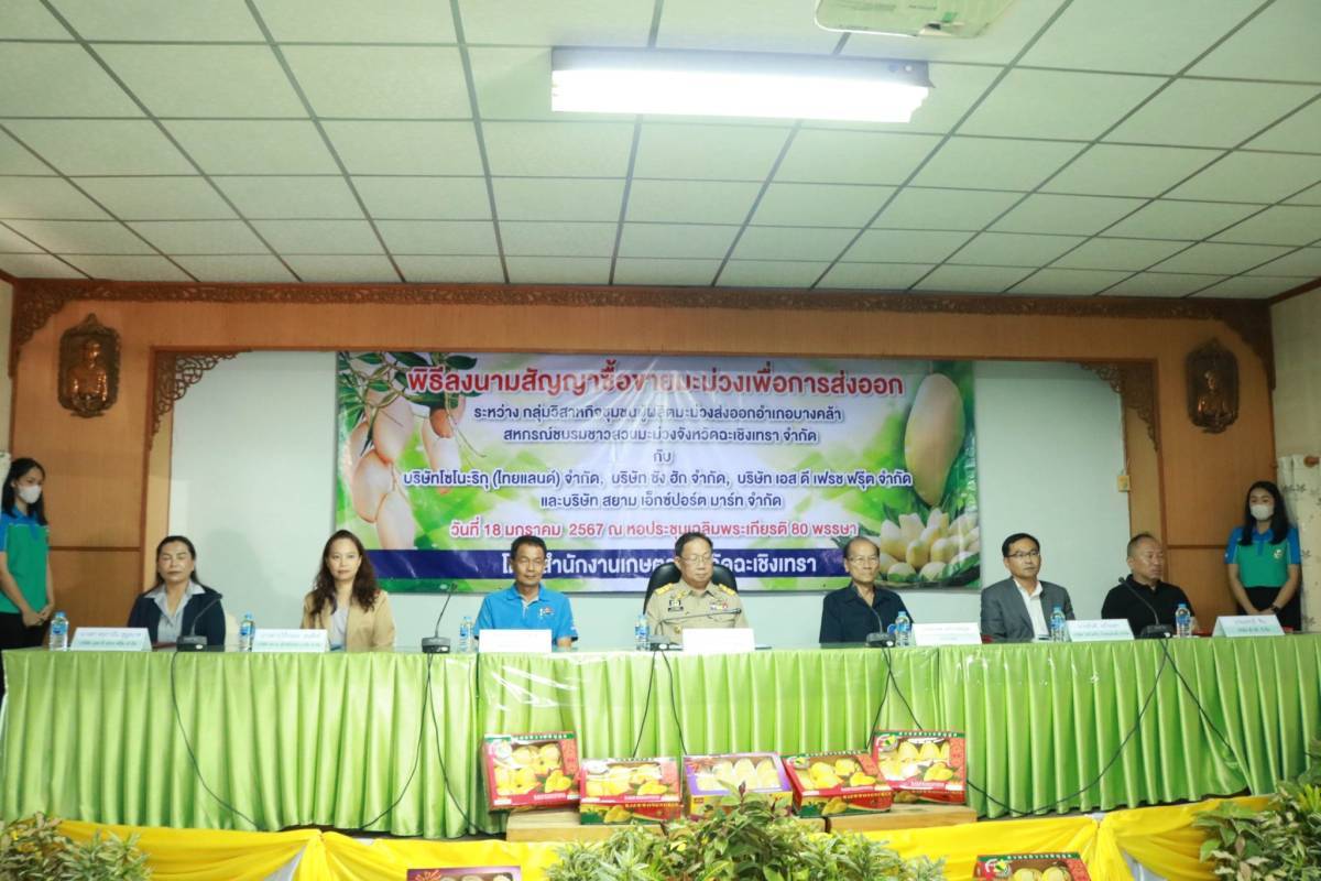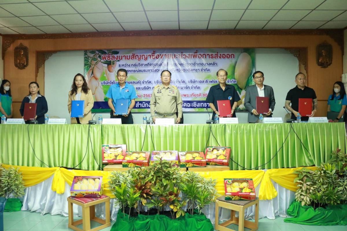 มะม่วงเป็นผลผลิตที่มีชื่อเสียงของจังหวัดฉะเชิงเทรา ซึ่งมีพื้นที่ปลูกกว่า 21,300 ไร่ ในเดือนมกราคม – พฤษภาคม เป็นช่วงที่ผลผลิตมะม่วงนอกฤดูและผลผลิตมะม่วงในฤดูของจังหวัดฉะเชิงเทราออกสู่ตลาด จังหวัดฉะเชิงเทรา จึงจัดพิธีลงนามสัญญาซื้อขายมะม่วงเพื่อการส่งออก ณ หอประชุมเฉลิมพระเกียรติ 80 พรรษา สำนักงานเกษตรจังหวัดฉะเชิงเทรา โดยมีนายกำพล สิริรัตตนนท์ รองผู้ว่าราชการจังหวัดฉะเชิงเทรา เป็นประธาน ในการลงนามสัญญาซื้อขายผลผลิตระหว่างเครือข่ายผู้ผลิตและผู้ส่งออกมะม่วงของจังหวัดฉะเชิงเทรา