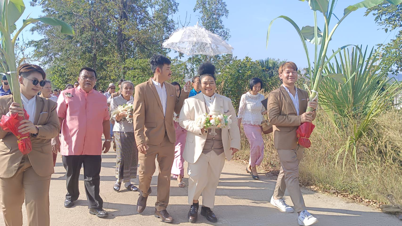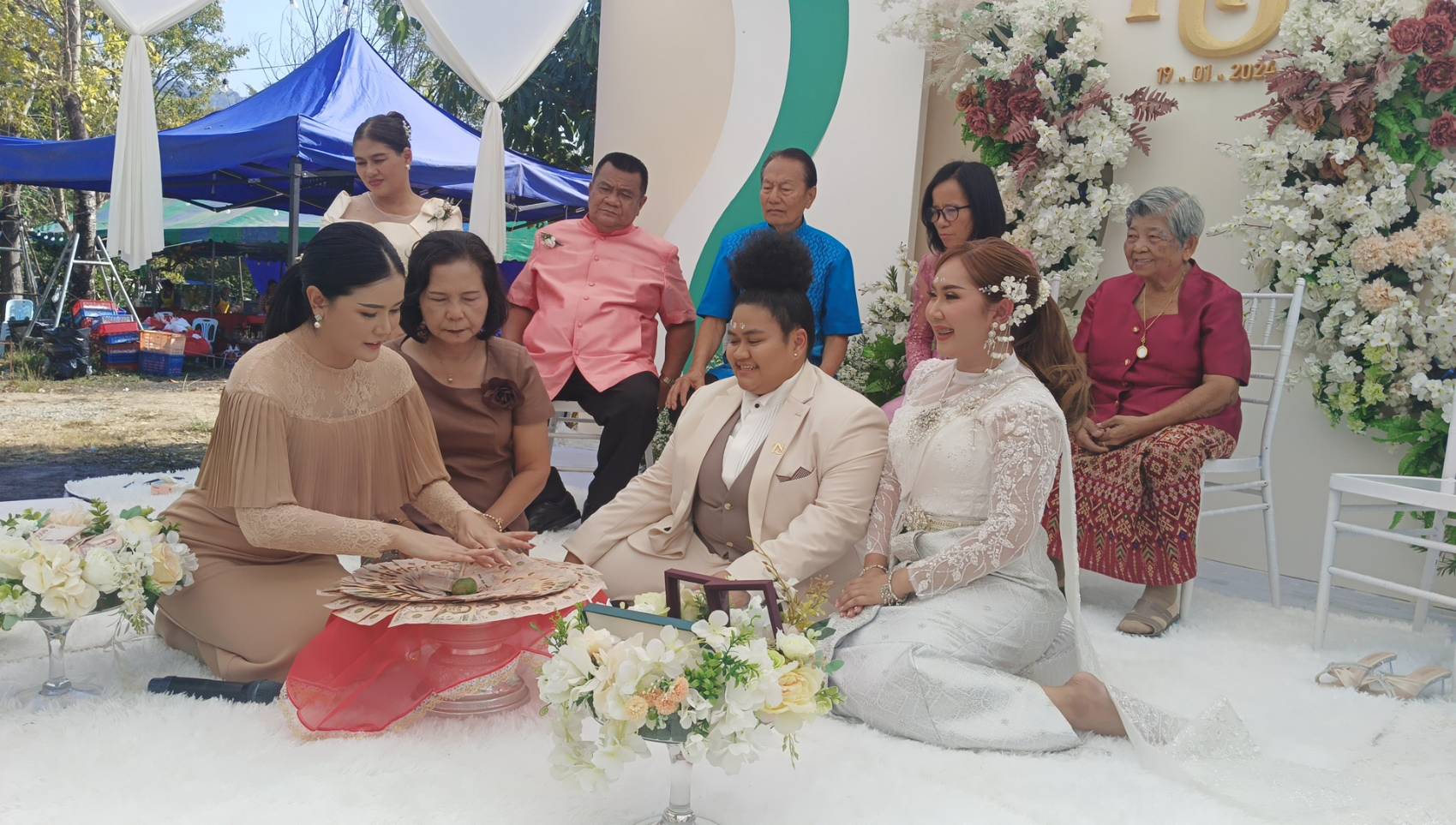 วันที่ 19 มกราคม 2567 ที่บ้านทับลาน เลขที่ 887 หมู่ 1 ต.บุพราหมณ์ อ.นาดี จ.ปราจีนบุรี นางสาวทิพวรรณ สรวงจันทราพร (ซีแนน) เจ้าบ่าวสาวหล่อวัย 34 ปี หอบสินสอดทองหมั้นเงินสด 6 แสนบาท, ทองคำ 6 บาท, แหวนเพชร 1.5 กะรัต, คอนโดย่านสุขุมวิท, และบ้านพักในกรุงเทพฯอีก 1 หลัง รวมมูลค่ากว่า 6 ล้าน เพื่อมาสู่ขอนางสาวปฤษณา กวางแก้ว (แนน) เจ้าสาววัย 38 ปี หญิงสาวที่คบหาดูใจกันมาถึง 6 ปี ทำเอาเพื่อนๆเจ้าสาวถึงกับอิจฉาไปตามๆกัน