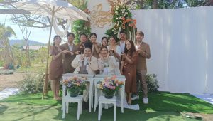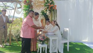 นางสาวทิพวรรณ สรวงจันทราพร (ซีแนน) เจ้าบ่าว ได้กล่าวกับผู้สื่อข่าวว่า ตนเองได้ทำอาชีพออแกไนซ์ อยู่ที่กรุงเทพฯ มากว่า 9 ปี ก่อนที่จะมาเจอกับนางสาวปฤษณา กวางแก้ว เจ้าสาว ที่ทำงานอยู่ในบริษัทเอกชน โดยได้พบเจอกันที่ค่ายอาสาในจังหวัดสระแก้ว จึงได้ตกลงคบหาดูใจกัน จากนั้นจึงได้ชวนให้แฟนสาวมาทำงานออแกไนซ์ด้วยกัน ก่อนที่จะตกลงปลงใจจัดงานแต่งในครั้งนี้ โดยทั้งสองได้ปรึกษากับผู้ใหญ่ทั้งสองฝ่าย เมื่อไม่มีฝ่ายใดคัดค้านจึงได้ร่วมกันจัดงานอย่างสวยงาม
