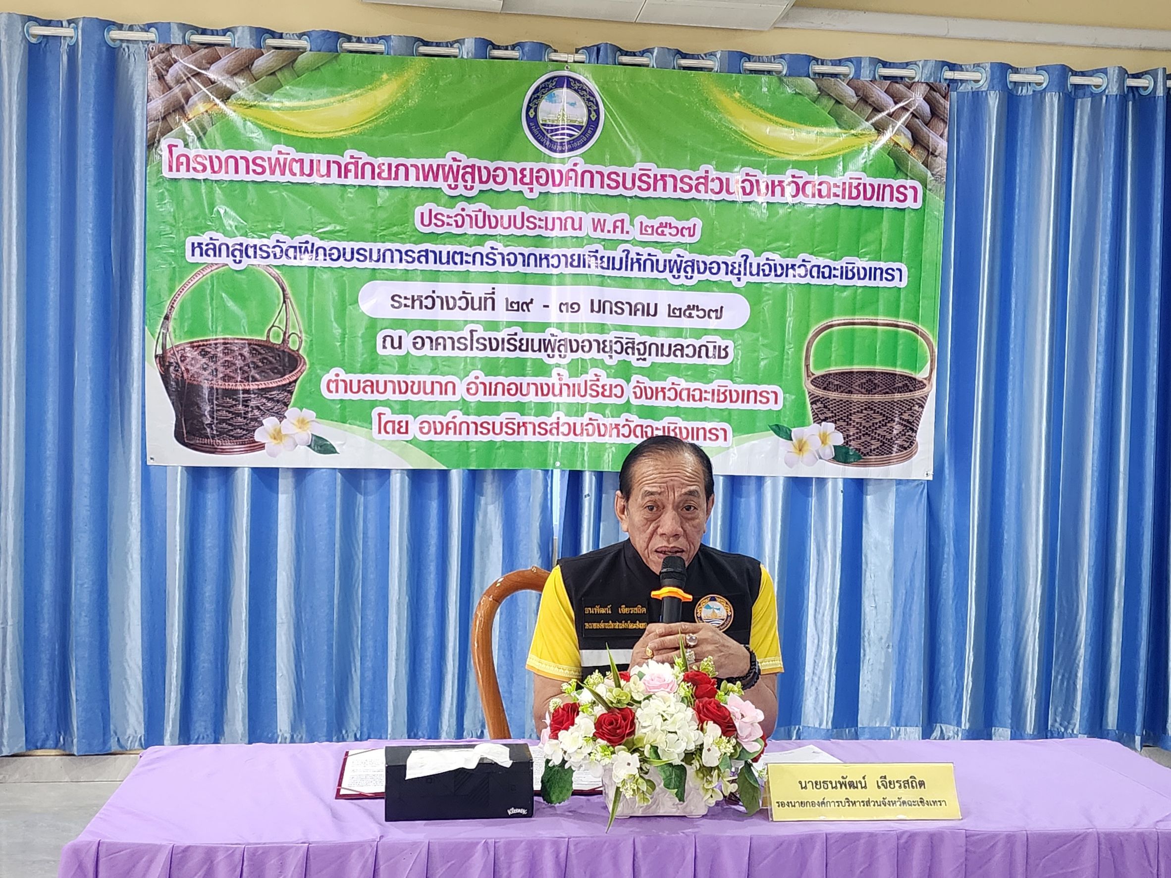 วันที่ 29 มกราคม 2567 นายกิตติ เป้าเปี่ยมทรัพย์นายกองค์การบริหารส่วนจังหวัดฉะเชิงเทรา มอบหมายให้นายธนพัฒน์ เจียรสถิต รองนายกองค์การบริหารส่วนจังหวัดฉะเชิงเทรา เป็นประธานเปิดโครงการพัฒนาศักยภาพผู้สูงอายุองค์การบริหารส่วนจังหวัดฉะเชิงเทรา ประจำปีงบประมาณ พ.ศ.2567 หลักสูตรจัดฝึกอบรมการสานตะกร้าจากหวายเทียม มี น.ส.สุภัสสร รังสินธุ์ หัวหน้าสำนักปลัด อบจ.ฉะเชิงเทรา กล่าวรายงาน พร้อมด้วยนายอภิสิทธิ์ โฉมศรี ประธานสาขาสมาคมสภาผู้สูงอายุแห่งปีะเทศไทยฯ ประจำจังหวัดฉะเชิงเทรา ผู้บริหารท้องถิ่น และหัวหน้าส่วนราชการ ร่วมพิธีเปิดโครงการ