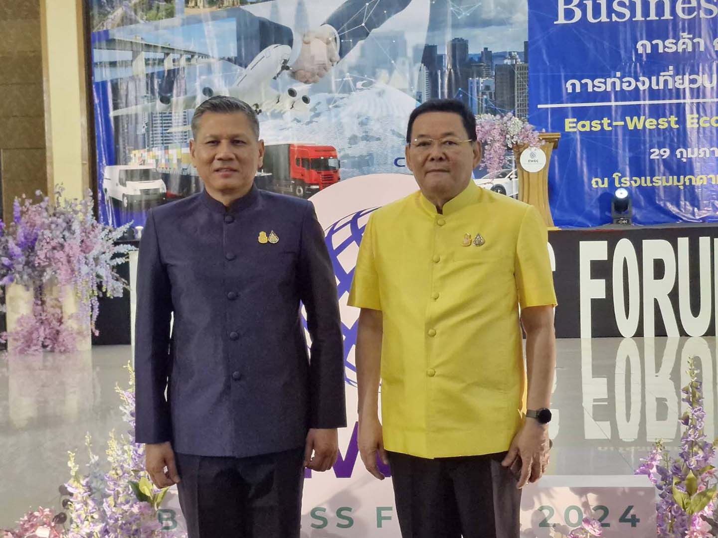 29 ก.พ. 67 ที่บริเวณหน้าศาลากลางจังหวัดมุกดาหาร นายนภินทร ศรีสรรพางค์ รัฐมนตรีช่วยว่าการกระทรวงพาณิชย์ พร้อมคณะได้เดินทางมาเป็นประธานเปิดงานจัดงาน EWEC Business Forum และมหกรรมการค้าชายแดน เพื่อส่งเสริมการรับรู้ด้านศักยภาพจังหวัด กลุ่มจังหวัด ส่งเสริมและยกระดับสินค้าสู่ตลาดสากล พัฒนาศักยภาพด้านการผลิต รวมทั้งเพื่อเพิ่มขีดความสามารถในด้านการแข่งขันให้กับผู้ประกอบการระดับประเทศและต่างประเทศ และเพื่อกระตุ้นเศรษฐกิจ สร้างรายได้ในจังหวัดภูมิภาคตะวันออกเฉียงเหนือ ส่งเสริมธุรกิจขนาดกลางและขนาดย่อมในการขยายตลาดทั้งระดับประเทศและระดับภูมิภาค เสริมสร้างความร่วมมือทางการค้าและเศรษฐกิจของไทยกับประเทศเพื่อนบ้านให้กับผู้ประกอบการ ซึ่งเป็นแนวทางที่สอดคล้องกับนโยบายรัฐบาลในการเปิดประตูการค้าชายแดน 4 ด้าน 4 ประเทศ โดยมีนายรณรงค์ พูลพิพัฒน์ อธิบดีกรมการค้าต่างประเทศ, นายวรญาณ บุญณราช ผู้ว่าราชการจังหวัดมุกดาหาร , คณะผู้แทนและผู้ประกอบการจากสาธารณรัฐประชาชนจีน , สาธารณรัฐสังคมนิยมเวียดนาม , สาธารณรัฐประชาธิปไตยประชาชนลาว , ดร.กานต์พนธ์ เตชะเดชอภิพัฒธ์ ประธานหอการค้าจังหวัดมุกดาหาร หน่วยงานราชการ หัวหน้าส่วน ภาครัฐ และภาคเอกชน ให้การต้อนรับ