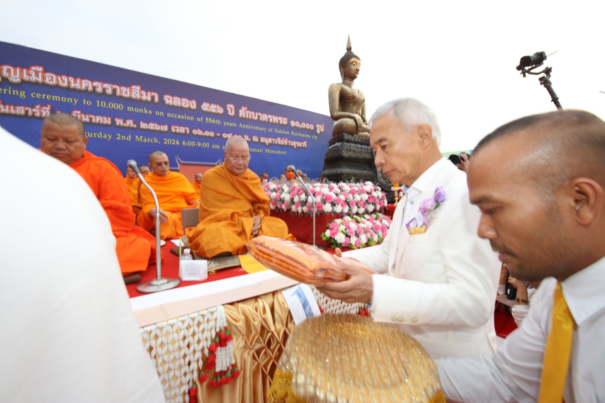 วันนี้ (2 มี.ค.67) เวลา 06.00 น. ณ บริเวณลานอนุสาวรีย์ท้าวสุรนารี อ.เมืองนครราชสีมา จ.นครราชสีมา นายสุวัจน์ ลิปตพัลลภ อดีตรองนายกรัฐมนตรี ประธานพรรคชาติพัฒนากล้า เป็นประธานในพิธีตักบาตรพระสงฆ์ 10,000 รูป สมโภชเมืองนครราชสีมา 556 ปี ถวายเป็นพุทธบูชา น้อมถวายเป็นพระราชกุศลแด่สมเด็จพระบรมไตรโลกนาถ สมเด็จพระนารายณ์มหาราช ผู้สถาปนาเมืองนครราชสีมา พระบาทสมเด็จพระบรมชนกาธิเบศร มหาภูมิพลอดุลยเดชมหาราช บรมนาถบพิตร และอุทิศส่วนกุศลแด่ท้าวสุรนารี วีรสตรีเมืองโคราช พร้อมด้วย นายสยาม ศิริมงคล ผู้ว่าราชการจังหวัดนครราชสีมา นายเทวัญ ลิปตพัลลภ หัวหน้าพรรคชาติพัฒนากล้า และที่ปรึกษาของนายกรัฐมนตรี นายวัชรพล โตมรศักดิ์ รองหัวหน้าพรรคชาติพัฒนากล้า และผู้ช่วยรัฐมนตรีประจำกระทรวงสาธารณสุข นางยลดา หวังศุภกิจโกศล นายกองค์การบริหารส่วนจังหวัดนครราชสีมา นายประเสริฐ บุญชัยสุข นายกเทศมนตรีนครนครราชสีมา ร่วมพิธี