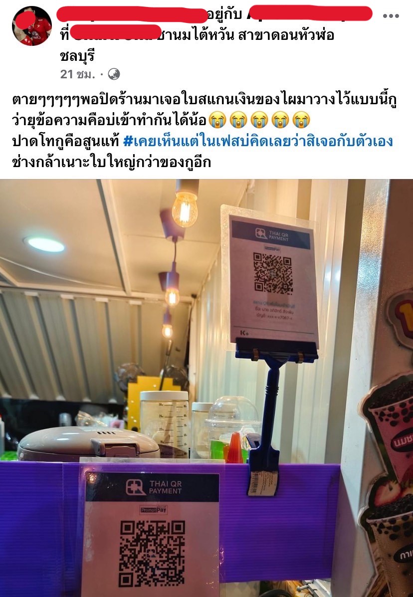 ปาดโทกูคือสูนแท้ #เคยเห็นแต่ในเฟสบ่คิดเลยว่าสิเจอกับตัวเอง ช่างกล้าเนาะใบใหญ่กว่าของกูอีก ” พร้อมกับ QR Code บัญชีธนาคารกสิกรไทย ของคนอื่นใช้ชื่อว่า นางสายอังคณา ขันสันเที๊ยะ ที่ตั้งอยู่คู่กับของตัวเองโดยแผ่นของอีกคนเป็นแผ่นใหญ่มองเห็นเด่นชัด “ เมื่อมีการโพสต์ดังกล่าวลงในกลุ่มของกลุ่มพ่อค้าแม่ค้าขายน้ำปั่นและน้ำชงชา ทำเอาพ่อค้าแม่ค้าเข้ามาคอมเม้นต์และแชร์เตือนภัยโพสต์ดังกล่าวออกไปจำนวนมาก