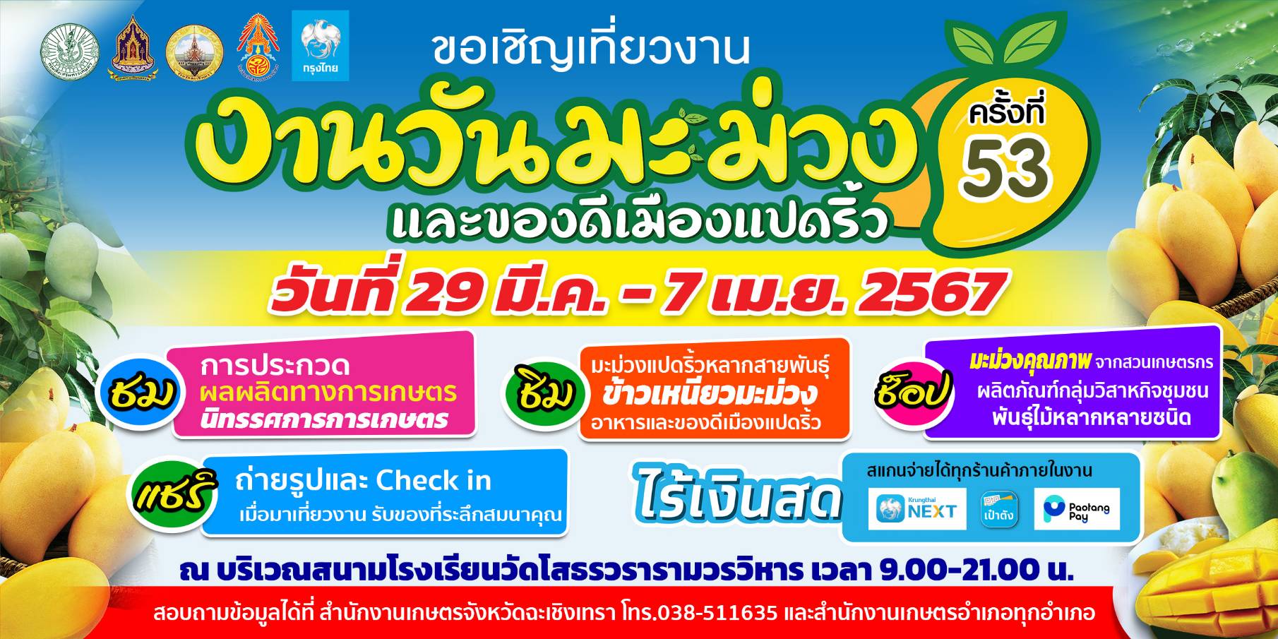 ขอเชิญเที่ยวงานวันมะม่วงและของดีเมืองแปดริ้ว ครั้งที่ 53 ระหว่างวันที่ 29 มีนาคม – 7 เมษายน 2567 เวลา 09.00 – 21.00 น. ณ บริเวณสนามโรงเรียนวัดโสธรวรารามวรวิหาร อำเภอเมืองฉะเชิงเทรา จังหวัดฉะเชิงเทรา