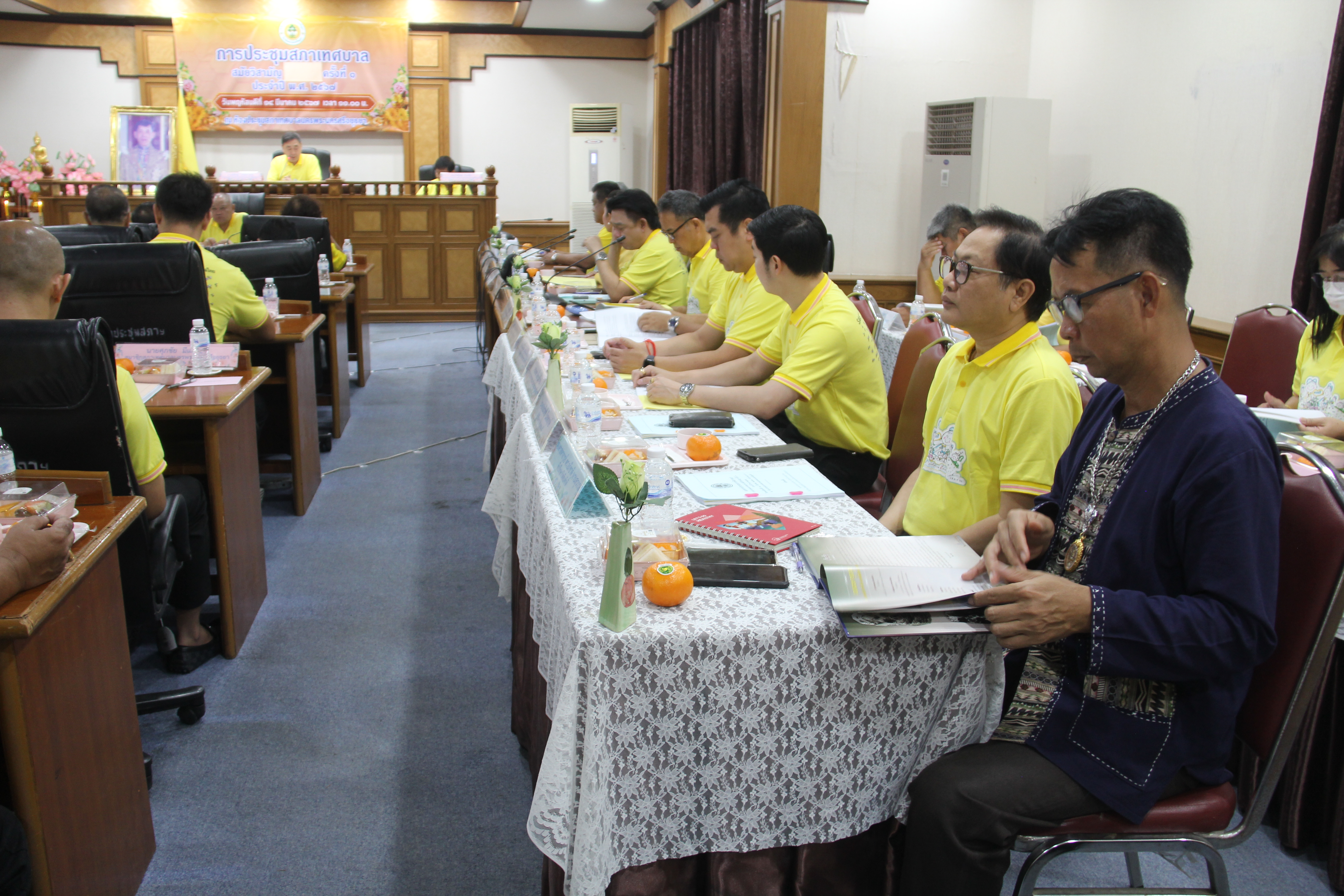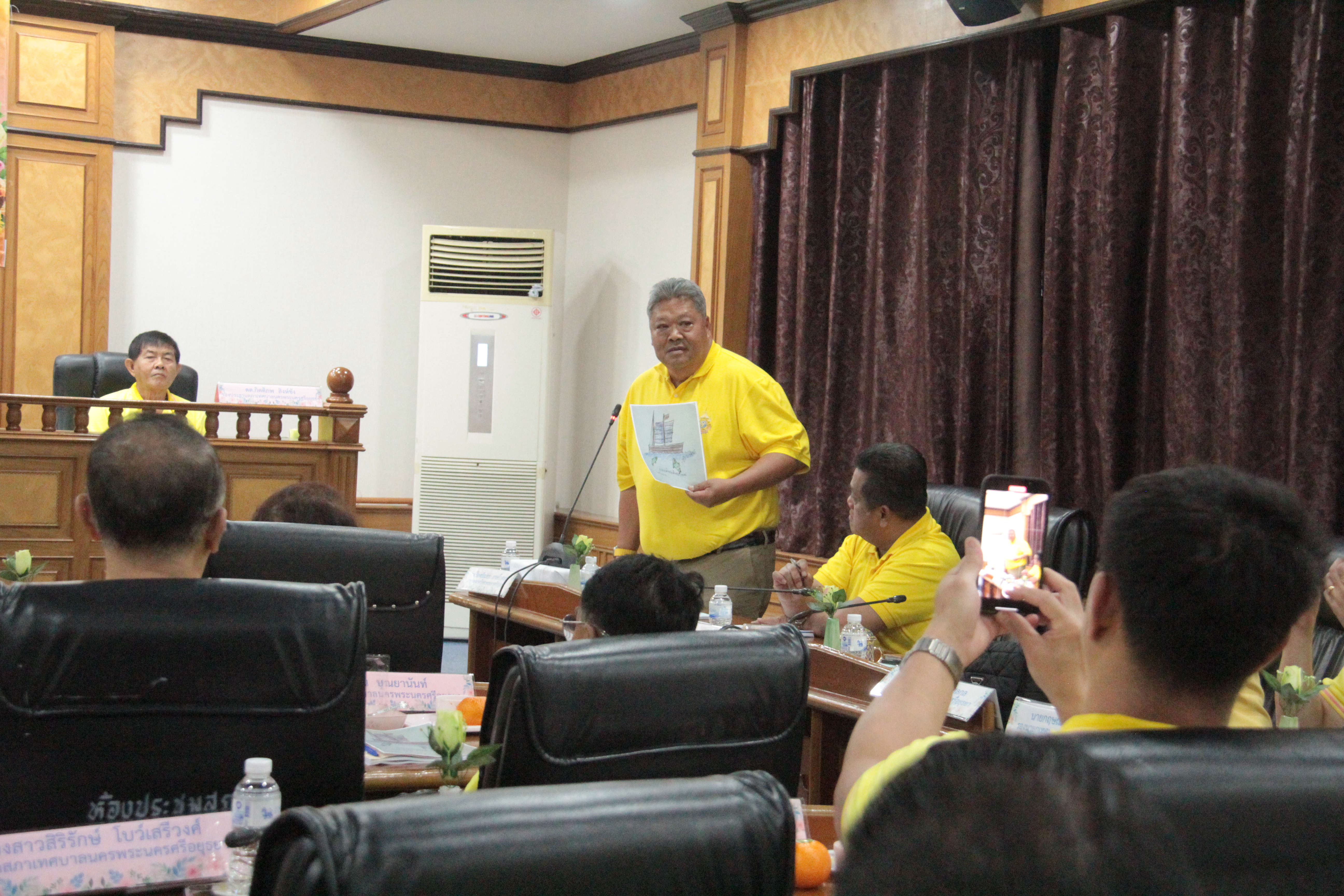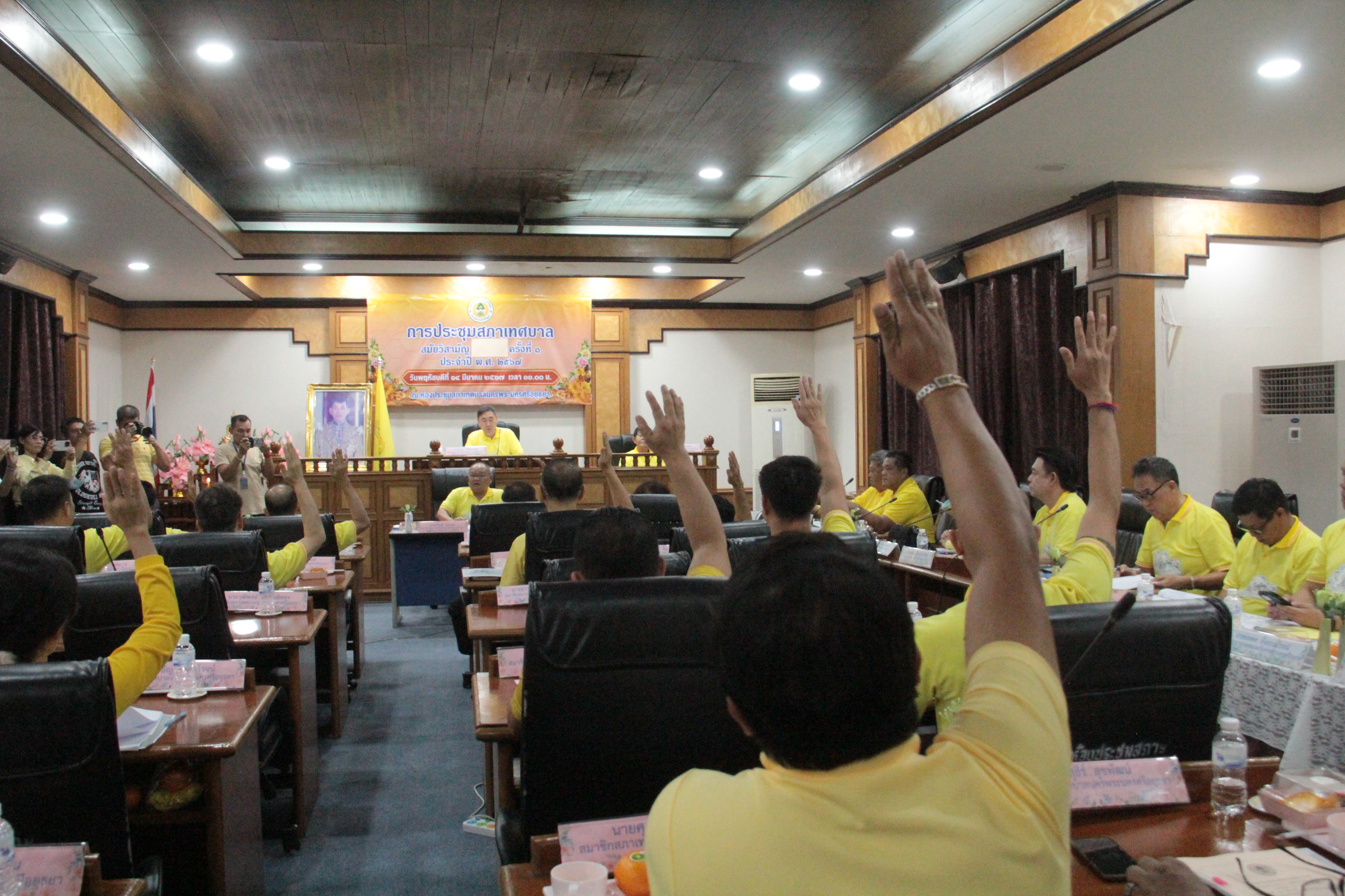 วันที่ 15 มีนาคม 2567 ที่ห้องประชุมสภาเทศบาลนครพระนครศรีอยุธยา มีการประชุมสภาเทศบาลสมัยวิสามัญ ครั้งที่ 1 ประจำปี 2567 ว่าที่ร้อยตรีสมทรง สรรพโกศลกุล นายกเทศมนตรีนครพระนครศรีอยุธยา นำคณะผู้บริหารพร้อมสมาชิกสภาเทศบาลนครพระนครศรีอยุธยา (สท.) พร้อมใจใส่เสื้อเหลือง และร่วมกันร้องเพลงสรรเสริญพระบารมีก่อน เข้าร่วมประชุมพร้อมกับฝ่ายราชการ ในการพิจารณาขออนุมัติใช้จ่ายเงินสะสม โครงการต่างๆ โดยมีนาย นายพิสิษฐ์ โชติอัครสมิต ทำหน้าที่ ประธานสภา