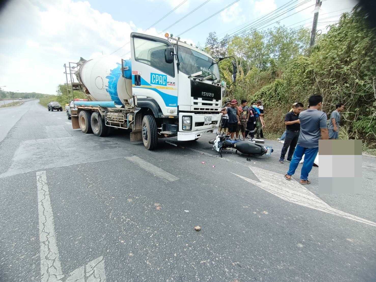 วันที่ 25 มี.ค. 2567 พนักงานสอบสวน สภ.ทุ่งใหญ่ จ.นครศรีธรรมราช รับแจ้งเกิดอุบัติเหตุรถบรรทุกโม่ปูนชนรถจักรยานยนต์ มีคนเสียชีวิต 1 ราย บาดเจ็บ 1 ราย เหตุเกิดบนถนนสายเอเชีย 41 นครศรีฯ – กรุงเทพ ขาล่องใต้ หมู่ 7 บ้านทับควาย ต.ปริก อ ทุ่งใหญ่ จึงพร้อมด้วยเจ้าหน้าที่มูลนิธิมต้เต็กตึ๊งทุ่งใหญ่ รีบเดินทางไปตรวจสอบ