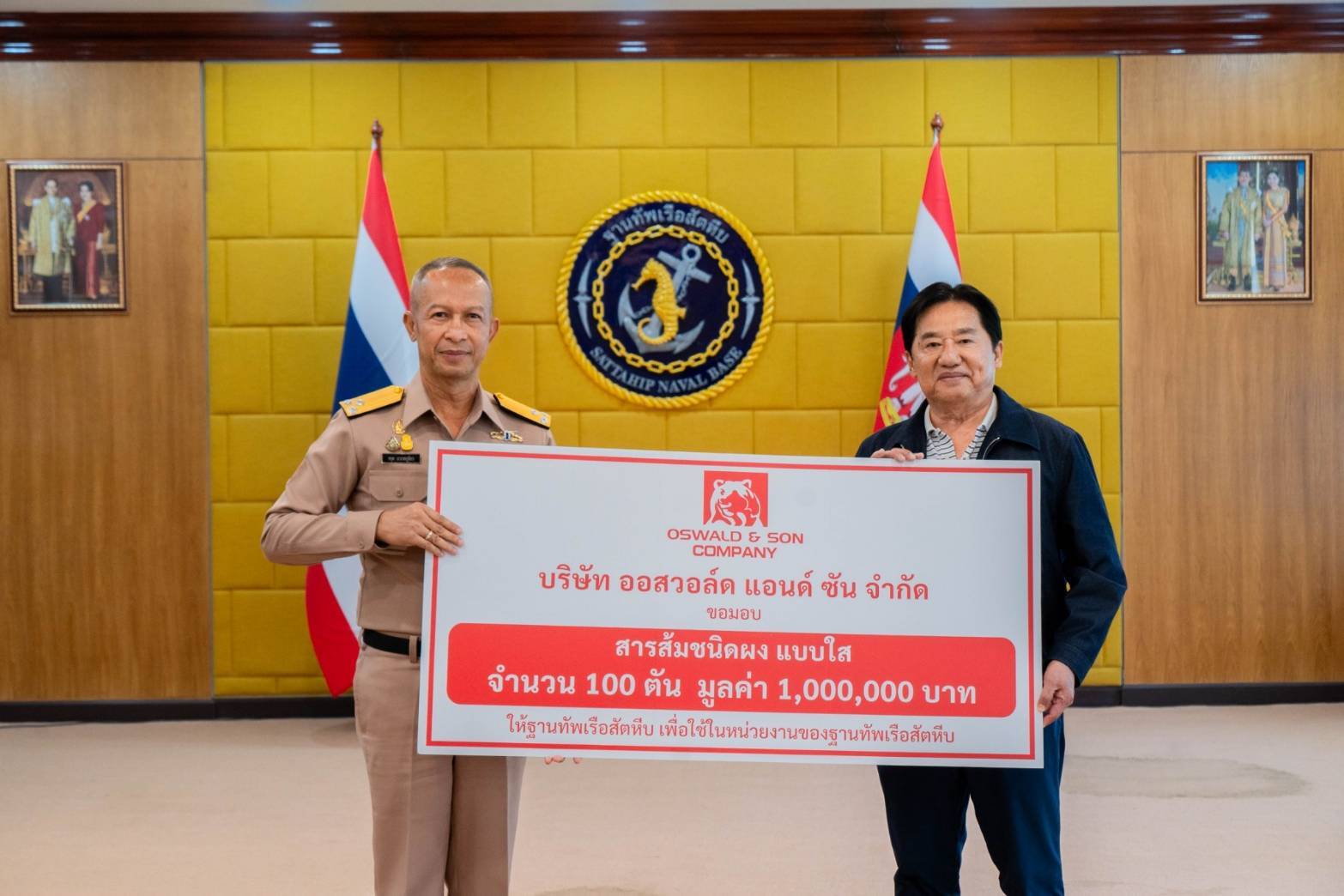 บริษัท ออสวอล์ดแอนด์ซัน จำกัด โดย นายสุรชัย ตั้งใจตรง กรรมการบริหารบริษัทฯ ได้มอบสารส้มชนิดใสแบบผง จำนวน 100 ตัน ให้กับฐานทัพเรือสัตหีบ โดย พลเรือโท ชยุต นาเวศภูติกร ผู้บัญชาการฐานทัพเรือสัตหีบ เป็นผู้รับมอบ ณ กองบัญชาการ ฐานทัพเรือสัตหีบ อ.สัตหีบ จ.ชลบุรี เมื่อ 25 มี.ค.67 เพื่อนำไปปรับปรุงคุณภาพน้ำดิบของอ่างเก็บน้ำคลองบางไผ่ ก่อนนำไปผลิตน้ำประปาให้กับหน่วยงานราชการต่างๆ ของกองทัพเรือพื้นที่สัตหีบ รวมถึงประชาชนในพื้นที่