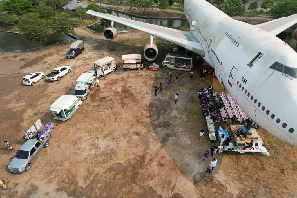วันที่ 3 เมษายน 2567 บริเวณสามแยกลำลูกบัว บางเลน คุณเกษม ศรมยุรา พร้อมด้วย คุณโกญจนาท ศรมยุรา ประธาน และ นายนภเดช เกลียวศิริกุล นายอำเภอดอนตูม คุณโกญจนาท ศรมยุรา ได้กล่าววัตถุประสงค์ของการเปิดตลาดมีตติ้มาร์เก็ตโบอิ้ง 747 ในครั้งนี้.เพื่อส่งเสริมการท่องเที่ยวและพัฒนาเศรษฐกิจชุมชนในเขตจังหวัดนครปฐมตามแนวทางส่งเสริมเศรษฐกิจของรัฐบาล และสนับสนุนผลิตภัณฑ์ซอฟพาวเว่อร์ในท้องถิ่นโดยบริษัทเคซีเอฟ ไพร์มฟู้ด จำกัดมีแนวความคิดในการสร้างอัตลักษณ์ สร้างจุดเด่นในการสร้างแลนด์มาร์คใหม่ในพื้นที่อำเภอบางเลน จังหวัดนครปฐม ( บริเวณ 3แยกลำลูกบัว)