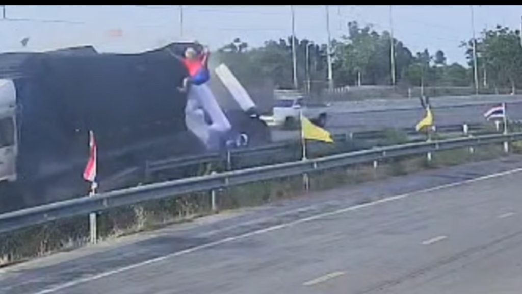เมื่อช่วงเย็นของวันที่ 3 เมษายน 2567 วงจรปิดจับวินาทีชีวิตยักษ์ชนยักษ์คนขับกระเด็นตกจากรถคอหักคาที่ คู่กรณีอ้าง พระอาทิตย์แยงตามองไม่เห็น นี่คือภาพจากกล้องวงจรปิด บันทึกภาพขณะ เหตุการณ์ รถพ่วง 18 ล้อชนท้ายรถ 10 ล้อ ทำให้คนขับกระเด็น ตกจากรถเสียชีวิต เหตุเกิดบนถนนพระราม 2 ขาล่องใต้ กิโลเมตรที่ 71+200 หน้าการไฟฟ้าสมุทรสงคราม ม.1 ต.คลองโคนอ