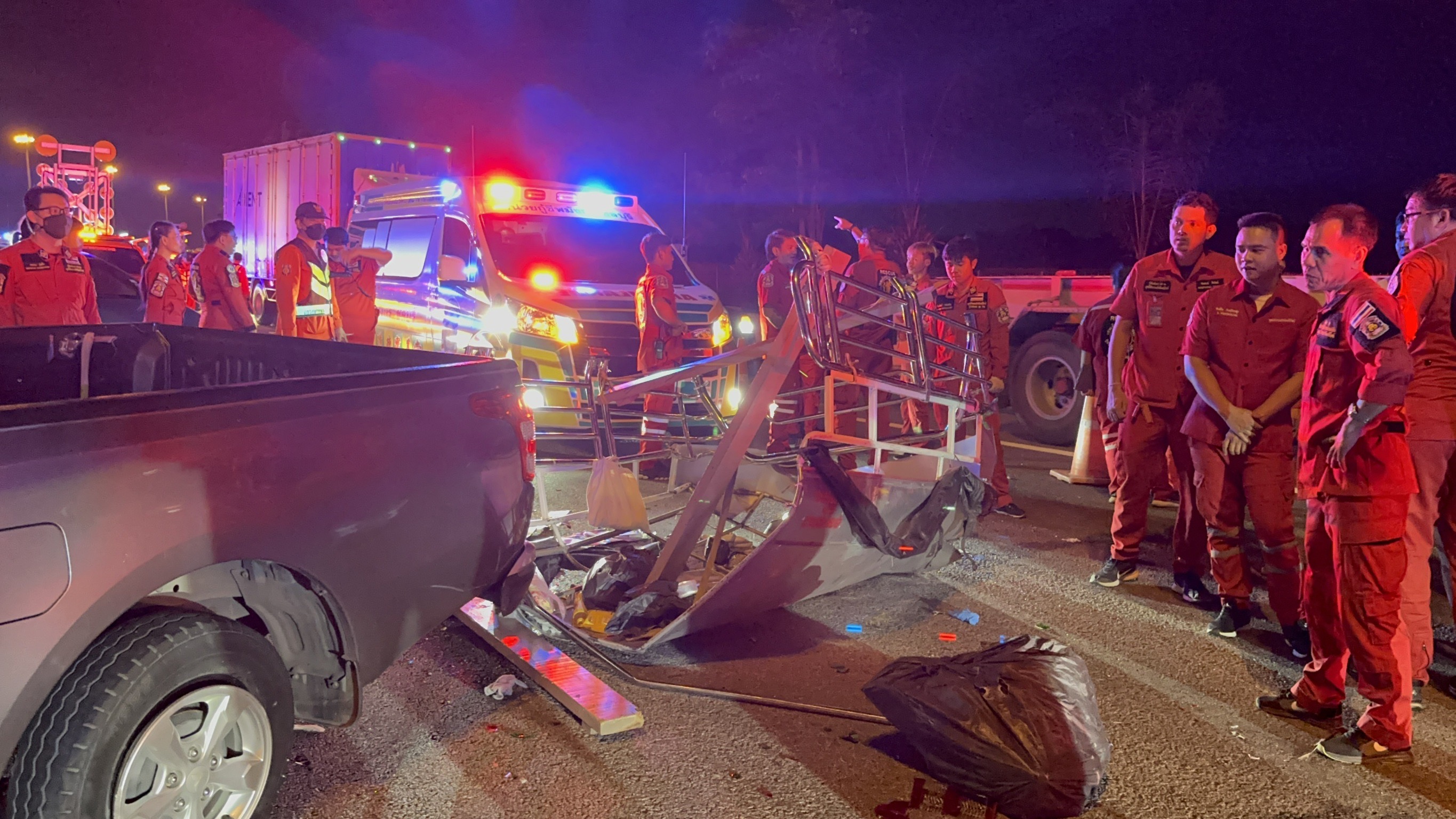 เมื่อเวลา 23.00 น. วันที่ 6 เมษายน 2567 เจ้าหน้าที่กู้ภัยมูลนิธิธรรมรัศมีมณีรัตน์ได้รับแจ้งมีอุบัติเหตุรถกระบะพลิกคว่ำมีผู้ได้รับบาดเจ็บ 13 ราย บนถนนมอเตอร์เวย์ กม.ที่ 55+800 ขาเข้า กทม. ช่วงตำบลบางนาง อำเภอพานทอง จังหวัดชลบุรี หลังรับแจ้งหนี้ไปตรวจสอบพร้อมกำลังอาสากู้ภัยในที่เกิดเหตุพบรถกระบะมิตซูบิชิไททัน สีบรอนเทา สภาพพังยับเยินโดยมีหลังคากระบะหลุดออกพังยับจากการตรวจสอบในที่เกิดเหตุพบผู้ได้รับบาดเจ็บทั้งหมด 13 รายเป็นหญิง 4 ราย เป็นผู้ชาย 9 ราย ทั้งหมดมีสภาพบาดแผลถลอกและศีรษะแตกเท่านั้นกู้ภัยเร่งปฐมพยาบาลเบื้องต้นผู้ได้รับบาดเจ็บทั้งหมดนำตัวส่งโรงพยาบาลทันที