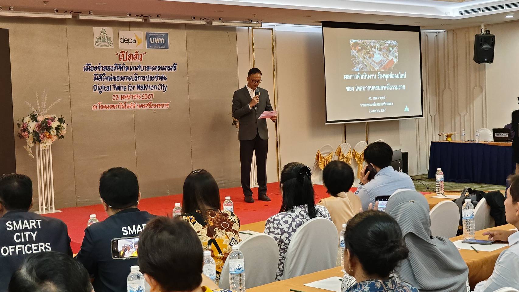 วันที่ 23 เม.ย. 2567 ที่ห้องประชุม โรงแรมทวิลโลตัส อ.เมืองนครศรีธรรมราช ดร.กณพ เกตุชาติ นายกเทศมนตรีนคร นครศรีธรรมราช เป็นประธานเปิดตัว เมืองจำลอง “ Digital Twins for Nakhon City” ซึ่งเทศบาลนคร นครศรีธรรมราช ผนึกกำลัง depa เพื่อสร้างเมืองจำลอง เทศบาลนคร นครศรี มิติใหม่ของงานประชาชน Digital Twins for Nakhon City โดยเป็นไปตามนโยบายของรัฐบาลในการนำเทคโนโลยีดิจิทัลมาพัฒนาประเทศ ทั้งในด้านเศรษฐกิจ การท่องเที่ยว และที่สำคัญ คือการนำเทคโนโลยีสมัยใหม่มาขับเคลื่อนองค์กรภาครัฐฯ ให้มีความทันสมัย ทันโลก พัฒนาการทำงานขององค์กรให้มีประสิทธิภาพสูงสุด และ Metaverse เป็นหนึ่งในโครงการต่างๆ และเพื่อสอดรับกับแนวทางการดำเนินงานของรัฐบาล เทศบาลนคร นครศรีธรรมราช จึงจัดงานเปิดตัว เมืองจำลอง เทศบาลนคร นครศรี มิติใหม่ของงานประชาชน Digital Twins for Nakhon City ขึ้นอย่างยิ่งใหญ่