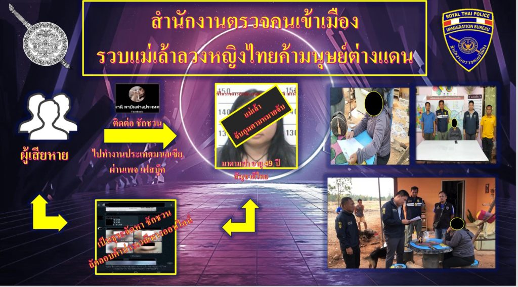 ตม.จว.สงขลา ร่วมกับ กก.ปอพ.บก.สส.สตม. และ กก.สส.บก.ตม.4 จับกุม มาดามฟา (นามสมมติ) อายุ 49 ปี สัญชาติไทย ตามหมายจับศาลจังหวัดนาทวี ที่ 102/2567 ลงวันที่ 28 มี.ค.2567 ต้องหาว่ากระทำความผิดฐาน ร่วมกันเป็นธุระจัดหา ล่อไปหรือพาไปเพื่อการอนาจารซึ่งหญิงโดยใช้กลอุบายหลอกลวง ขู่เข็ญเพื่อให้บุคคลนั้นกระทำการค้าประเวณี สมคบกันค้ามนุษย์โดยแสวงหาประโยชน์โดยมิชอบด้วยการบังคับค้าประเวณี โดยร่วมกันเป็นธุระจัดหา พามาจาก จัดให้พักอาศัย โดยข่มขู่ ใช้กำลังบังคับหลอกลวงใช้อำนาจโดยมิชอบด้วยกฎหมายและข่มขืนใจให้ผู้กระทำการใด ไม่กระทำการใดหรือยอมหรือจำยอมต่อสิ่งใดอันเป็นการฝ่าฝืนกฎหมาย นำตัวส่ง พนักงานสอบสวน สภ.ปาดังเบซาร์ จว.สงขลา ดำเนินคดีตามกฎหมาย สถานที่จับกุม บริเวณหน้าบ้านพักในพื้นที่ ต.โพธิ์ชัย อ.โคกโพธิ์ชัย จว.ขอนแก่น กรณีนี้สืบเนื่องจากเจ้าหน้าที่ชุดสืบสวน ตม.จว.สงขลา เข้าช่วยเหลือหญิงไทยเดินทางมาจากประเทศมาเลเซียแล้วแจ้งว่าถูกหลอกไปค้าประเวณีที่ประเทศมาเลเซีย จึงรายงานให้ผู้บังคับบัญชาทราบพร้อมทั้งประสาน สหวิชาชีพสัมภาษณ์คัดกรองตามกลไกการส่งต่อระดับชาติ (NRM) ได้ความว่าผู้เสียหายต้องการไปทำงานที่ประเทศมาเลเซีย จึงติดต่อผ่านนายหน้าทางสื่อออนไลน์ แต่เมื่อไปถึงประเทศมาเลเซียกลับถูกแม่เล้าแจ้งว่าต้องพักอาศัย ในคอนโดมิเนียมแห่งหนึ่งในเมืองกัวลาลัมเปอร์