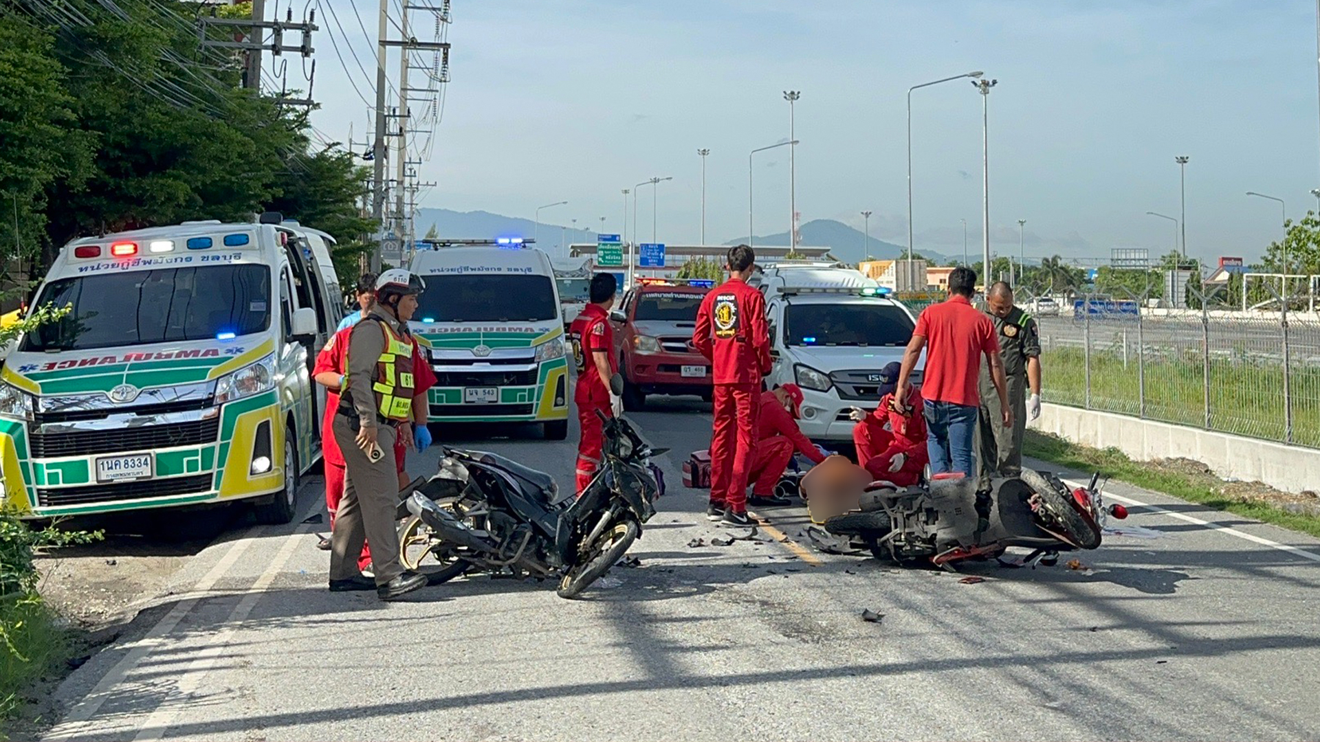 เมื่อเวลา 08.40 น. วันที่ 26 พ.ค.67 ร.ต.อ.กิตติเวช งาสุวรรณ รอง สว.(สอบสวน) สภ.ดอนหัวฬ่อ ได้รับแจ้งมีรถชนกันมีผู้ได้รับบาดเจ็บบนถนนเลียบมอเตอร์เวย์ หมู่ 2 ต.ดอนหัวฬ่อ อ.เมือง จ.ชลบุรี จึงรุดไปตรวจสอบพร้อมกู้ภัยมูลนิธิธรรมรัศมีมณีรัตน์ พบคนเจ็บนอนบนถนนได้รับบาดเจ็บรวม 3 ราย โดยมีผู้ได้รับบาดเจ็บขี่รถ จยย.ยี่ห้อฮอนด้า เวฟ สีดำ (ไม่ทราบชื่อ) อาการสาหัส กู้ภัยฯปฐมพยาบาลเบื้องต้นรีบนำส่ง รพ.ชลบุรี