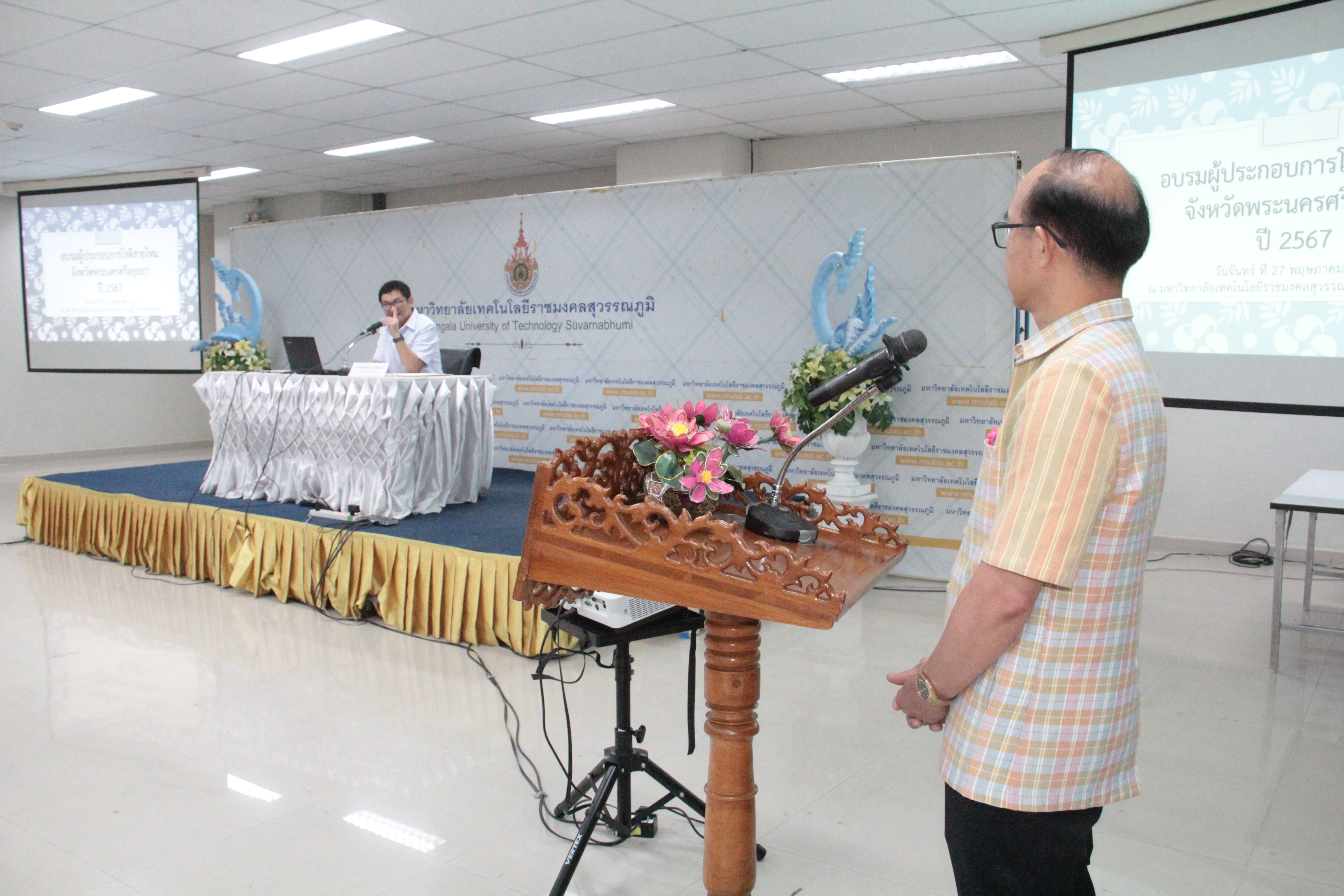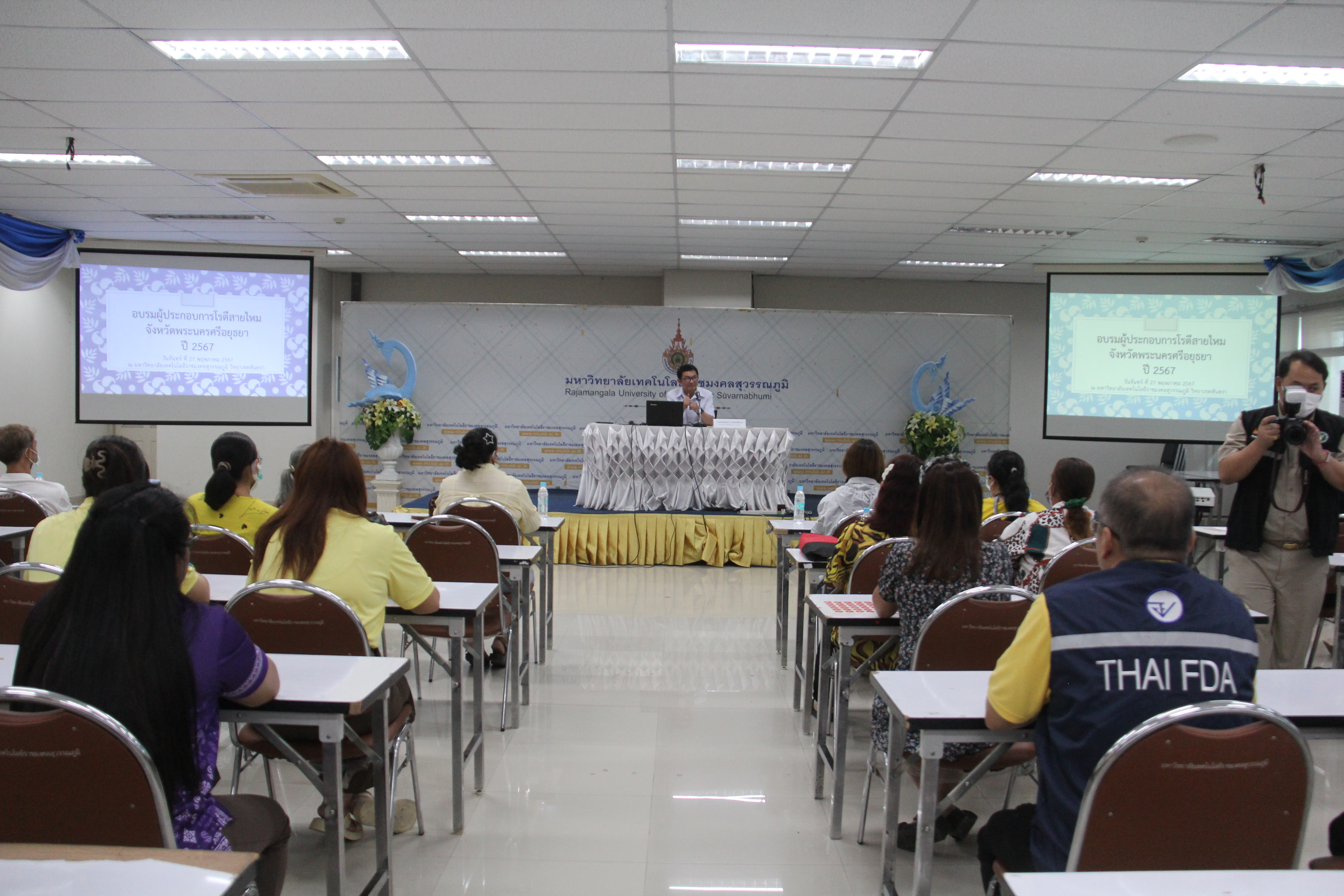 วันที่ 27 พฤษภาคม 2567 ที่ ห้องประชุมชั้น 8 อาคาร 24 มทร.สุวรรณภูมิ ศูนย์พระนครศรีอยุธยา หันตรา นพ.ยุทธนา วรรณโพธิ์กลาง นายแพทย์สาธารณสุขจังหวัดพระนครศรีอยุธยา เป็นประธานเปิดโครงการอบรมผู้ประกอบการโรตีสายไหม โดยมี เภสัชกรเทพศักดิ์ อังคณาวิศัลย์ รองนายแพทย์สาธารณสุขจังหวัดพระนครศรีอยุธยา กล่าววัตถุประสงค์ของการอบรม มีผู้ประกอบการร้านค้าโรตีสายไหม ของจังหวัดพระนครศรีอยุธยา จำนวน 70 คน เข้าร่วมการอบรม และได้รับเกียรติจาก ผศ.ดร.วิจิตรา เหลียวตระกูล คณบดี คณะเทคโนโลยีการเกษตรและอุตสาหกรรมเกษตร มหาวิทยาลัยเทคโนโลยีราชมงคลสุวรรณภูมิ ผศ.พาขวัญ ทองรักษ์ รองคณบดี คณะเทคโนโลยีการเกษตรและอุตสาหกรรมเกษตร และคณาจารย์ เข้าร่วมโครงการ