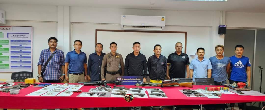( 01 มิ.ย.67 ) ที่กองกับการสืบสวนตำรวจภูธรจังหวัดฉะเชิงเทรา พล.ต.ต.นเรวิช สุคนธวิท ผบก.ภ.จว.ฉะเชิงเทรา พร้อมด้วยพ.ต.อ.สมชาย อยู่สวัสดิ์ รอง ผบก. ภ.จว.ฉะเชิงเทรา เดินทางมาตรวจสอบผลการระดมกวาดล้างอาชญากรรม โดยมี พ.ต.อ.นิตย์ วิธินันทกิตต์ ผกก.สืบสวน ภ.จว.ฉะเชิงเทรา / พ.ต.ท.สุรเดช นาคหมวก รอง ผกก.สืบสวน ภ.จว.ฉะเชิงเทรา / พ.ต.ต.กิตติกานต์ บุญช่วยเหลือ สว.กก.สืบสวน ภ.จว.ฉะเชิงเทรา พร้อมชุดชป. 1 กก.สืบสวน ภ.จว.ฉะเชิงเทรา ควบคุมตัวผู้ต้องหา อายุ 37 ปี พร้อมของการอาวุธปืนสั้นขนาดต่างๆ จำนวนกว่า 20 กระบอก อาวุธปืนยาวติดลำกล้อง .22 / อาวุธปืนยาวอัดลม เบอร์12 หัวลูกกรด เครื่องกระสุนปืนหลายร้อยนัด ซากชิ้นส่วนอาวุธปืน และเครื่องตกแต่งอาวุธปืนอีกจำนวนหนึ่ง พร้อมยาบ้า จำนวน 4 เม็ด เครื่องเสพยาเสพติดและผลตรวจปัสสาวะ