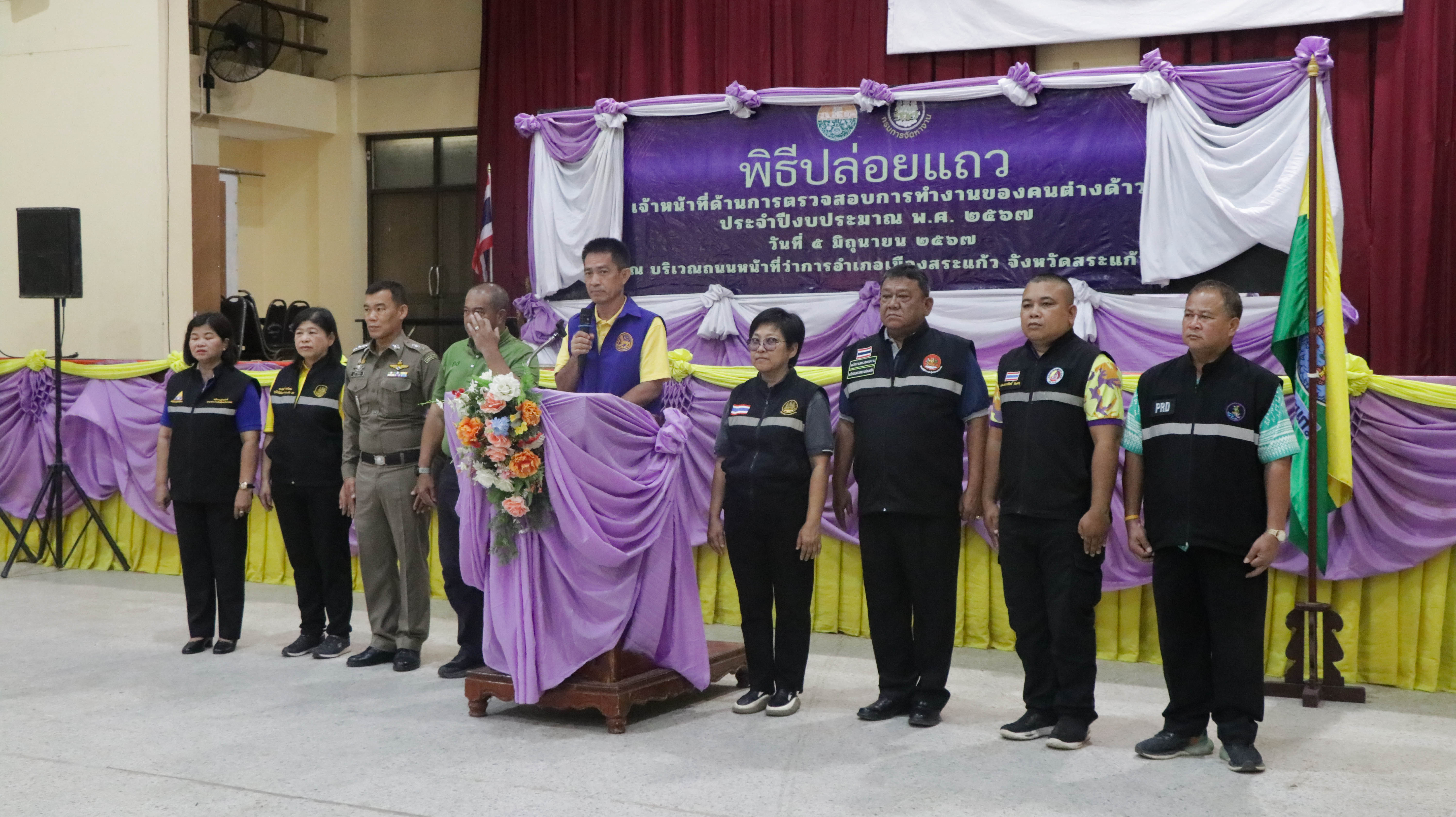 ณ หอประชุมอำเภอเมืองสระแก้ว อำเภอเมืองสระแก้ว ผู้สื่อข่าวรายงาน นายสุเทพ ชัยวัฒน์ ปลัดจังหวัดสระแก้ว เป็นประธานปล่อยแถว เจ้าหน้าที่ด้านการตรวจสอบการทำงานของคนต่างด้าว พร้อมด้วย นายปรีชา ดุจจานุทัศน์ ผู้อำนวยการสำนักงานจัดหางานกรุงเทพมหานครพื้นที่ 3 รักษาราชการแทน จัดหางานจังหวัดสระแก้ว นายอำเภอเมืองสระแก้ว หัวหน้าส่วนราชการ ข้าราชการเจ้าหน้าที่ร่วมพิธีฯ โดยสำนักงานจัดหางานจังหวัดสระแก้ว ร่วมกับ กองอำนวยการรักษาความมั่นคงภายในจังหวัดสระแก้ว สถานีตำรวจภูธรเมืองสระแก้ว สำนักงานตรวจคนเข้าเมืองจังหวัดสระแก้ว สำนักงานพัฒนาสังคมและความมั่นคงของมนุษย์จังหวัดสระแก้ว อำเภอเมือสระแก้ว สำนักงานแรงงานจังหวัดสระแก้ว สำนักงานสวัสดิการและคุ้มครองแรงงานจังหวัดสระแก้ว สำนักงานประกันสังคมจังหวัดสระแก้ว สถาบันพัฒนาฝืมือแรงงาน 31 สระแก้ว จำนวนทั้งสิ้น 60 คน ร่วมพิธีปล่อยแถวเพื่อลงพื้นที่ตรวจสอบการทำงานของคนต่างด้าว นายจ้าง สถานประกอบการ เพื่อให้การบริหารจัดการการทำงานของคนต่างด้าวอย่างเป็นระบบและมีประสิทธิภาพ ส่งเสริมให้มีการจ้างแรงงานต่างด้าวที่ถูกต้องตามกฎหมายโดยแรงงานต่างด้าว จะได้รับการคุ้มครองตามกฎหมายไทยโดยเท่าเทียมกัน