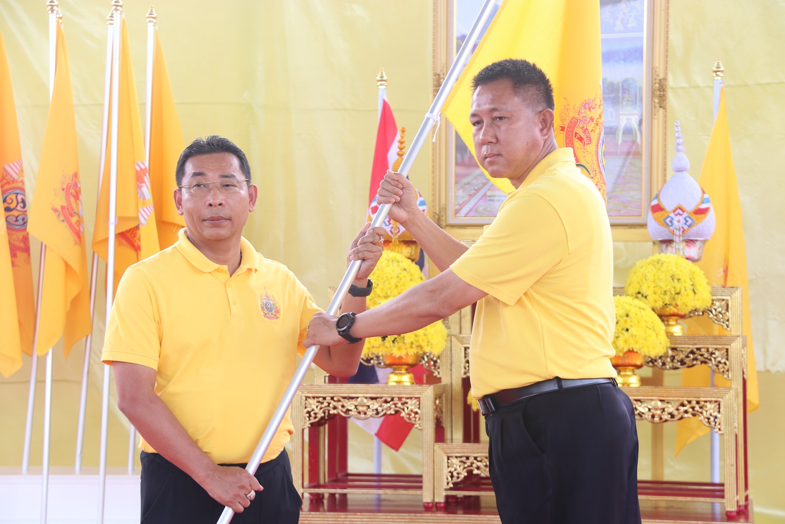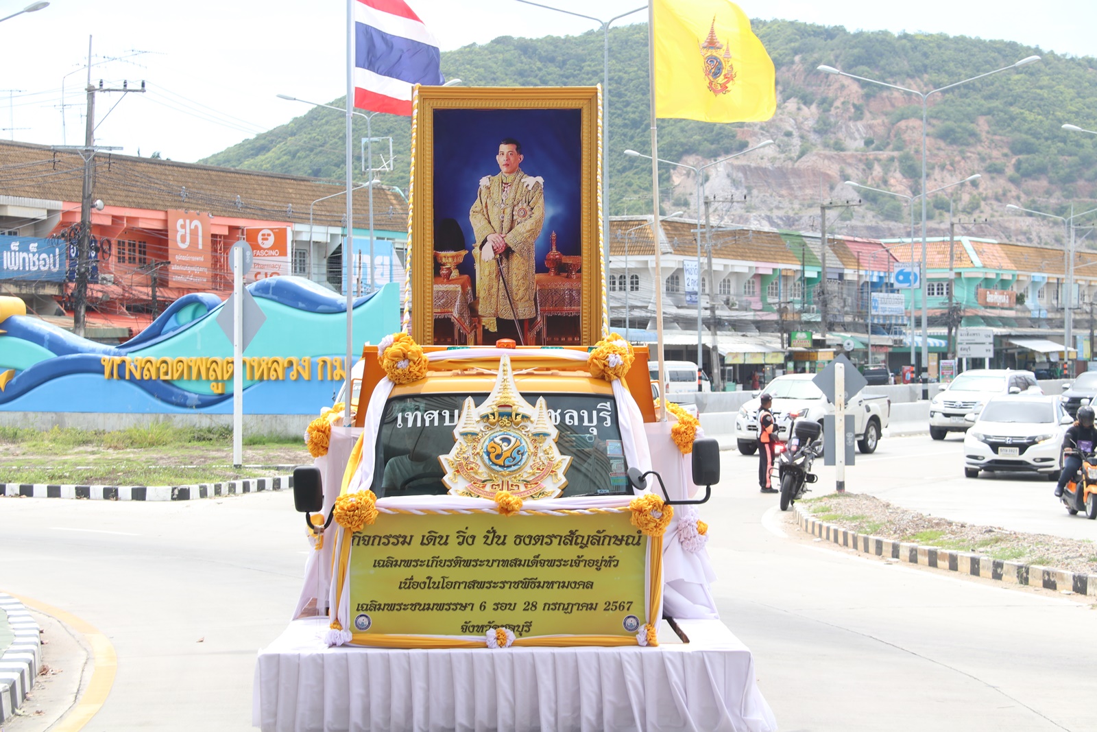 วันที่ 7 มิ.ย. 67ที่อาคารอเนกประสงค์ องค์การบริหารส่วนตำบลพลูตาหลวง อ.สัตหีบ จ.ชลบุรี นาย ธวัชชัย ศรีทอง ผู้ว่าราชราชการจังหวัดชลบุรี พร้อมด้วย นายภัควัต ขันธหิรัญ นายอำเภอสัตหีบ นาย อัมตะ ใคร่ครวญ นายก อบต.พลูตาหลวง หน่วยงานกองทัพเรือ องค์กรปกครองส่วนท้องถิ่น หน่วยงานภาครัฐ ภาคเอกชน ในทุกภาคส่วน ตลอดจนพี่น้องประชาชน ร่วม กิจกรรม เดิน วิ่ง ปั่น ธงตราสัญญาลักษณ์ งานเฉลิมพระเกียรติ พระบาทสมเด็จพระเจ้าอยู่หัว เนื่องในโอกาสพิธีมหามงคลเฉลิมพระชนมพรรษา 6 รอบ 28 กรกฎาคม 2567 โดยรับส่งมอบธงจาก ผู้ว่าราชการจังหวัดระยอง จำนวน 71 ธง มุ่งหน้าส่งมอบให้ อำเภอบางละมุง อำเภอศรีราชา อำเภอเมืองชลบุรี