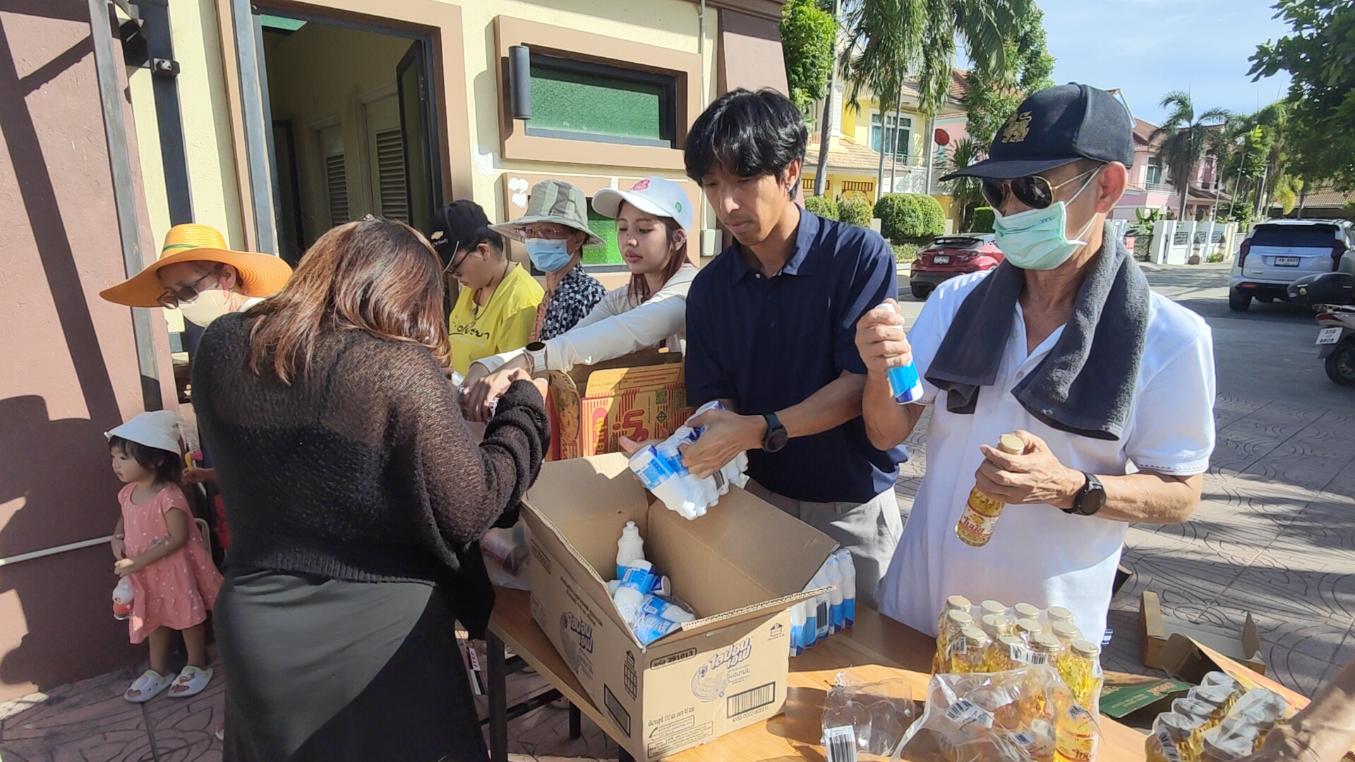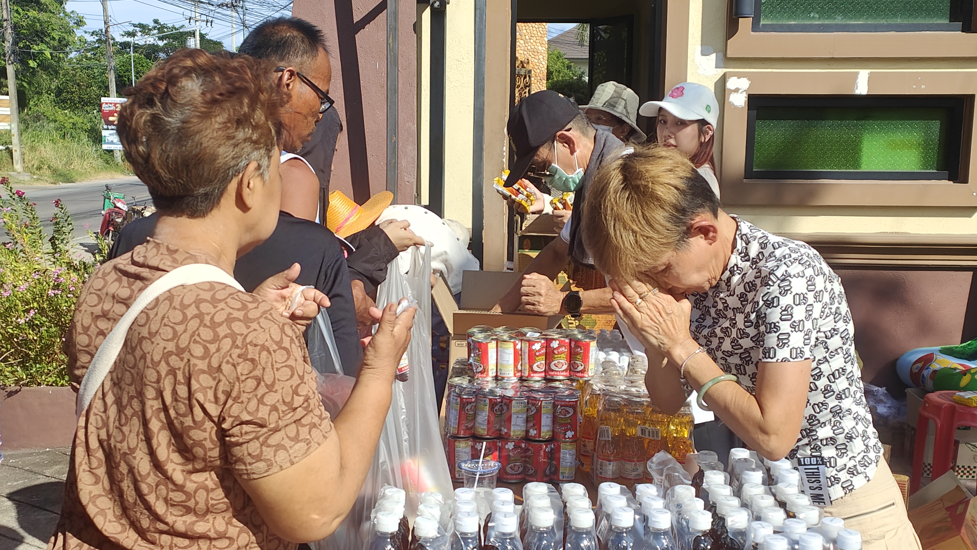 เมื่อเวลาประมาณ 16.00 วันนี้ (22 มิถุนายน 2567) ที่บริเวณหน้าโครงการหมู่บ้านไทยปุระ หมู่ 5 ตำบลหนองขาม อำเภอศรีราชา จังหวัดชลบุรี นางวิภาดา ทัศนโชติมา อายุ 68 ปี ผู้บริหารและเจ้าของสำนักงาน ชนาภาธุรกิจการบัญชี พร้อมด้วย นางพลอยนภัส ยินดีธนกิจ เจ้าของร้านยินดีเฮ้าส์ ครอบครัวและญาติ ร่วมกันนำข้าวสารอาหารแห้ง เช่น ข้าวสาร น้ำมันพืช น้ำปลา บะหมี่กึ่งสำเร็จรูป มาแจกให้แก่ชาวบ้านในพื้นที่ จำนวนกว่า 200 คน