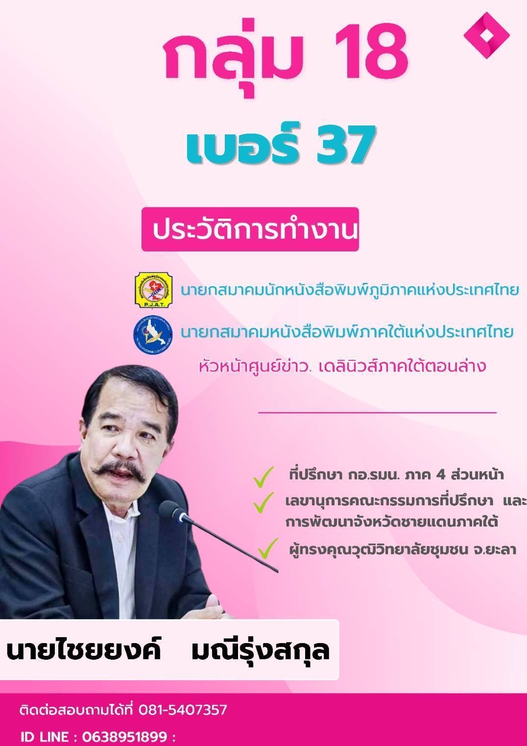 วันที่ 27 มิถุนายน 2567 รายงานจากสมาคมหนังสือพิมพ์ภาคใต้แห่งประเทศไทย ( สนต.) อ.หาดใหญ่ จ.สงขลา ว่ามีสมาชิกสมาคมหนังสือพิมพ์ภาคใต้ และ สมาคมนักหนังสือพิมพ์ภูมิภาคแห่งประเทศไทย(สนพท.)หลายร้อยคนได้ร่วมแสดงความยินดีกับนายไชยยงค์ มณีรุ่งสกุล นายกสมาคมฯทั้ง 2 สมาคมฯ ที่ได้รับความไว้วางใจด้วยการเลือกเป็นว่าที่สมาชิกวุฒิสภา (สว.)ซึ่งมีเพื่อนร่วมวิชาชีพสื่อสารมวลชนในกลุ่ม 18 อีก 9 คน