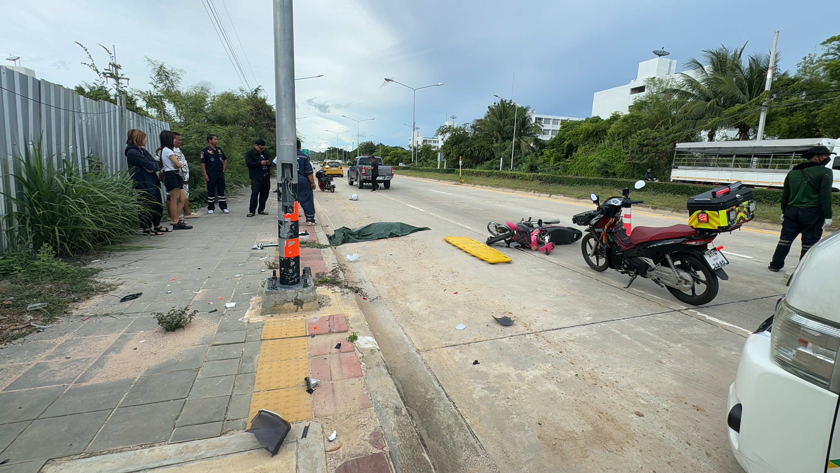 เมื่อเวลา 16.00 น.ของวันนี้ 1 ก.ค.67 ร.ต.อ.ธิติพงศ์ หงษาชาติ รอว สว.สอบสวน สภ.พลูตาหลวง จ.ชลบุรี ได้รับแจ้งมี จยย. ชนเสาไฟฟ้า ริมถนนหมายเลข 3126 ท่าอากาศยานอู่ตะเภา- ท่าเรือจุกเสม็ด ต.พลูตาหลวง อ.สัตหีบ จ.ชลบุรี มีผู้เสียชีวิต จึงรุดไปตรวจสอบพร้อม หน่วยกู้ภัยมูลนิธิสว่างโรจนธรรมสถาน