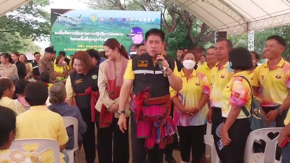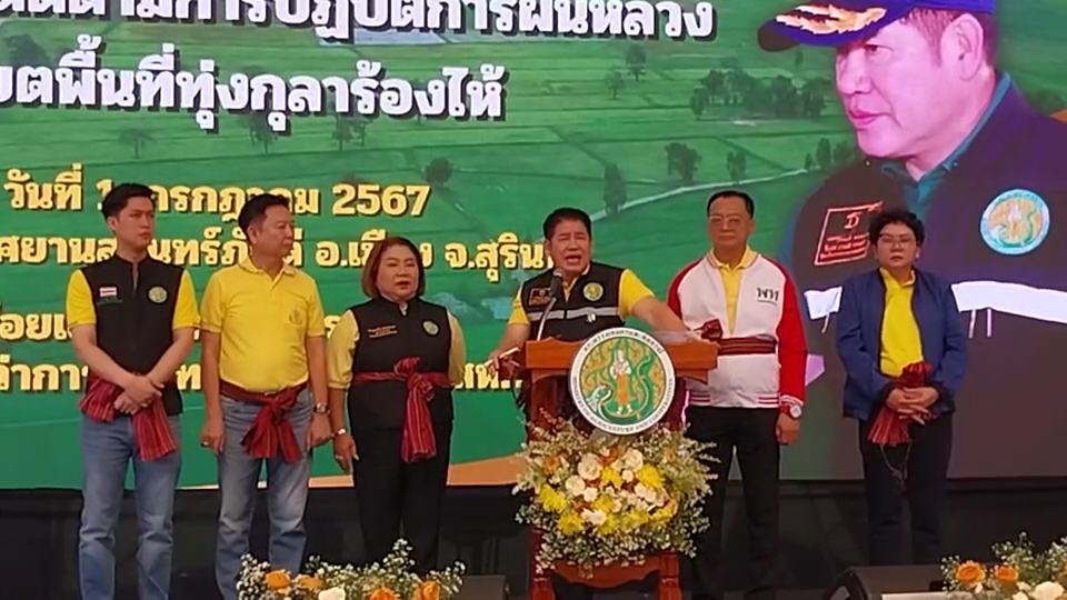 วันที่ 1 กรกฎาคม 2567 ร้อยเอก ธรรมนัส พรหมเผ่า รัฐมนตรีว่าการกระทรวงเกษตรและสหกรณ์ ลงพื้นที่ตรวจติดตามการปฏิบัติการฝนหลวงในเขตพื้นที่ทุ่งกุลาร้องไห้ โดยมี นายสุพิศ พิทักษ์ธรรม อธิบดีกรมฝนหลวงและการบินเกษตร พร้อมด้วยหน่วยงานในสังกัดกระทรวงเกษตรและสหกรณ์ในพื้นที่ให้การต้อนรับ โดยรัฐมนตรีว่าการกระทรวงเกษตรและสหกรณ์ ได้รับฟังรายงานการปฏิบัติการฝนหลวงในเขตพื้นที่ทุ่งกุลาร้องไห้ในช่วงที่ผ่านมา พร้อมมอบนโยบายแนวทางการปฏิบัติงานเพื่อช่วยบรรเทาปัญหาฝนทิ้งช่วง และให้กำลังใจเจ้าหน้าที่กรมฝนหลวงและการบินเกษตร ในการปฏิบัติภารกิจให้เกิดความสำเร็จลุล่วงไปได้ด้วยดี รวมถึงพบกับผู้แทนเกษตรกร ผู้แทนผู้ประกอบการค้าข้าว เพื่อการรับฟังปัญหาอุปสรรคในด้านการบริหารจัดการทรัพยากรน้ำ และนำมาใช้เป็นแนวทางในการวางมาตรการให้ความช่วยเหลือจากกระทรวงเกษตรและสหกรณ์ จากนั้นได้มอบเมล็ดข้าวพันธุ์ดีให้แก่ผู้แทนเกษตรกร สำหรับนำไปแจกจ่ายให้แก่เกษตรกรที่ยังไม่สามารถหว่านข้าวได้ในช่วงที่ผ่านมา เนื่องจากพื้นที่นั้นมีสภาพแห้งแล้งเกินไป รวมถึงเกษตรกรที่ประสบปัญหาภัยแล้งจนได้รับความเสียหายจากการหว่านข้าวในรอบแรก และมอบโฉนด เพื่อการเกษตร ให้แก่ผู้แทนเกษตรกร จำนวน 100 ราย เพื่อนำไปใช้ประโยชน์เฉพาะการเกษตรในการพัฒนา ต่อยอด ให้เกิดการสร้างอาชีพ สร้างรายได้ และความมั่นคงในชีวิต