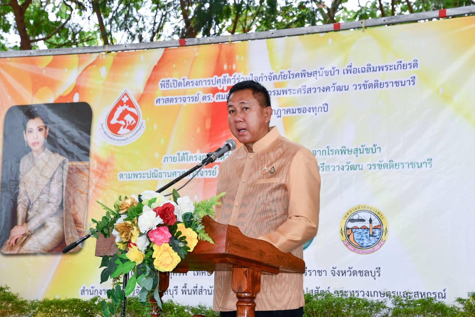 นายธวัชชัย ศรีทอง ผู้ว่าราชการจังหวัดชลบุรี เป็นประธานในพิธีสดุดีเทิดพระเกียรติและเปิดโครงการปศุสัตว์ร่วมใจกำจัดภัยโรคพิษสุนัขบ้าเพื่อเฉลิมพระเกียรติ ศาสตราจารย์ ดร.สมเด็จเจ้าฟ้าฯ กรมพระศรีสวางควัฒน วรขัตติยราชนารี ภายใต้โครงการสัตว์ปลอดโรคคนปลอดภัยจากโรคพิษสุนัขบ้าตามพระปณิธาน ศาสตราจารย์ ดร.สมเด็จเจ้าฟ้าฯ กรมพระศรีสวางควัฒน วรขัตติยราชนารี ประจำปีงบประมาณ พ.ศ.2567