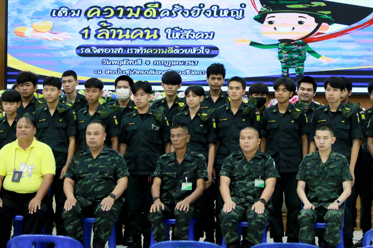 วันที่ 4 ก.ค.67 ที่หอประชุมวิทยาลัยเทคนิคฉะเชิงเทรา ถ.มหาจักรพรรดิ์ ต.หน้าเมือง อ.เมืองฉะเชิงเทรา นายรุ่งเรือง สูยะนันทน์ รองผอ.ฝ่ายพัฒนากิจการนักเรียน-นักศึกษา พร้อมด้วย นายนาวี ศรีหะทัย หัวหน้างานกิจกรรมนักเรียน-นักศึกษา นายนพพงษ์ ศรีดวงคำ รองหัวหน้างานกิจกรรมฯ นายนิวัตร ศรีคำสุข ผู้กำกับนักศึกษาวิชาทหาร นำนักศึกษาวิชาทหารชั้นปี 2-3 เข้าร่วมกิจกรรม เติมคนดีครั้งยิ่งใหญ่ 1 ล้านคนให้สังคม “รด.จิตอาสา เราทำความดี ด้วยหัวใจ” เพื่อถวายเป็นพระราชกุศล แด่พระบาทสมเด็จพระเจ้าอยู่หัวฯ ในโอกาสมหามงคลเฉลิมพระชนมพรรษา 6 รอบ 72 พรรษา