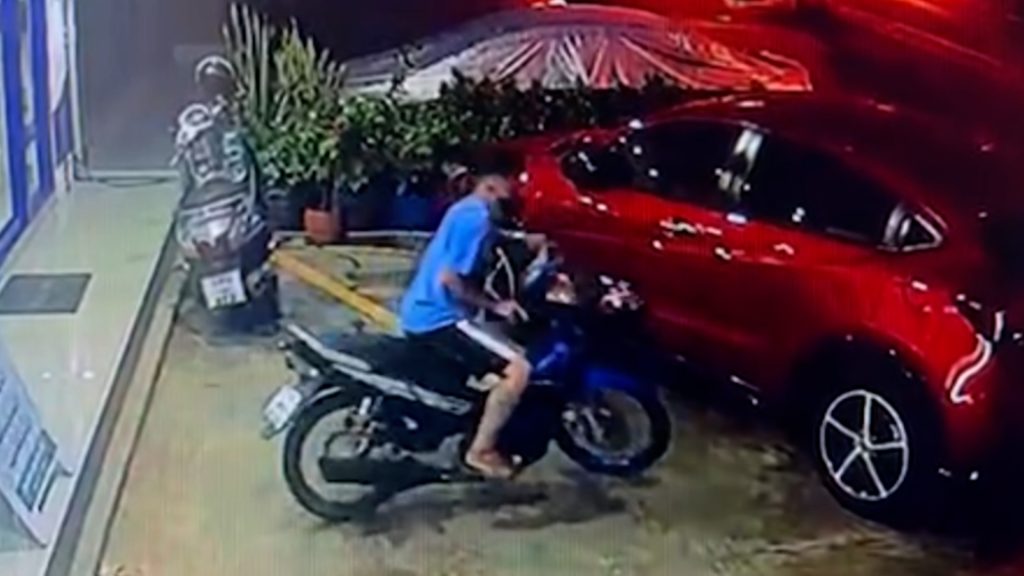 นี่คือภาพจากกล้องวงจรปิดบริเวณหน้าร้านซักผ้าใต้อพาร์ทเม้นท์แห่งหนึ่ง อยู่ใกล้เคียงกับอนุสาวรีย์แฝดสยามอิน-จัน ริมถนน ถนนเอกชัย-ลาดใหญ่ ม.3 ต.ลาดใหญ่ อ.เมืองสมุทรสงคราม บันทึกภาพเหตุการณ์ คนร้าย 4 คนขับขี่รถจักรยานยนต์ 2 คันมาดูลาดเลาก่อนที่จะมีชาย 1 ราย เดินเข้าไปปัสสาวะริมกำแพง และ เดินอ้อมเข้ามาคร่อมรถจักรยานยนต์ฮอนด้าเวฟ 125 สีน้ำเงิน-ดำ ทะเบียน 1กจ 4180 เพชรบุรี ของนายอภิชัย คุ้มแก้ว อายุ 33 ปี ผู้เสียหาย แล้วเข็นออกไปริมถนน ก่อนที่เพื่อนที่ตามมาด้วยกันขับประกบถีบกันออกไป เหตุเกิดเมื่อเวลา 05.30 น. ของวันที่ 5 กรกฎาคม 2567